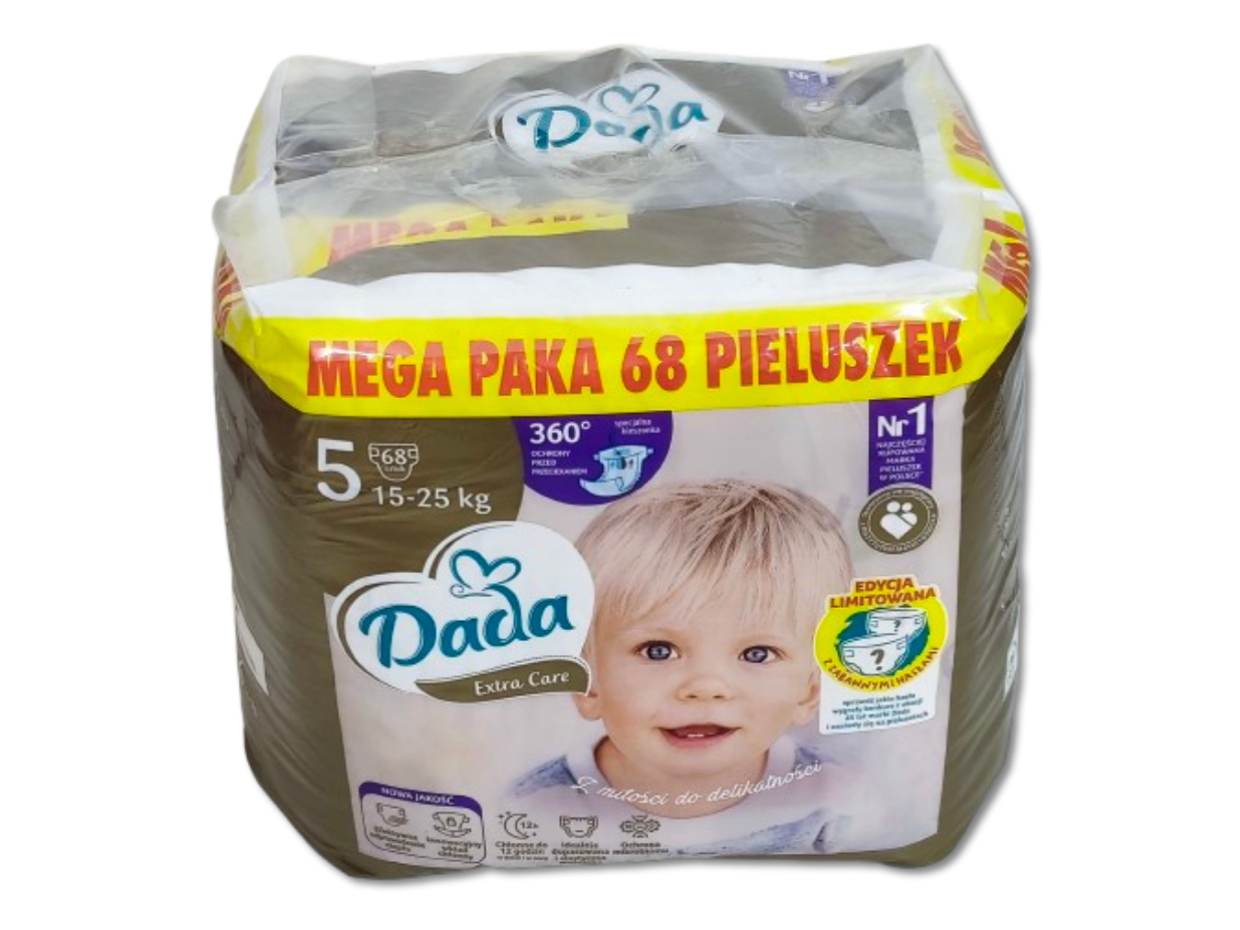 Jednorazowe pieluszki Dada Extra Care w rozmiarze 5, przeznaczone dla dzieci o wadze 15-25kg+. Pieluszki stworzone we współpracy z instytutem matki i dziecka, zapewniają komfort (do 12h suchości), są delikatne, miękkie, chronią przed przecieraniem i posiadają elastyczne boczki, zapewniające swobodę ruchów. Dzięki technologi Climaflex pieluszki efektywnie odprowadzają wilgoć i ciepło zapobiegając podrażnieniom. Pieluszki posiadają szerokie zapięcia ułatwiające ich zmianę. Anatomiczny kształt zapewnia lepsze dopasowanie, a miękka warstwa wewnętrzna (z powłoczką z witaminą E) zapewnia miękkość, delikatność i przewiewność. Pieluszki posiadają również specjalne płaskie gumeczki w nogawkach, które cztery razy lżej uciskają na skórę dziecka niż standardowe okrągłe gumki. Pieluszki nie są perfumowane co zmniejsza ryzyko podrażnień i alergii. Każda pieluszka posiada również identyfikator wilgotności, zmieniający kolor gdy pieluszka jest wilgotna, który podpowiada, kiedy należy zmienić pieluszkę. Opakowanie zawiera 68 pieluszek. Pieluszki posiadają pozytywną opinię Instytutu Matki i Dziecka. Limitowana edycja pieluszek z zabawnymi hasłami na pieluszkach.