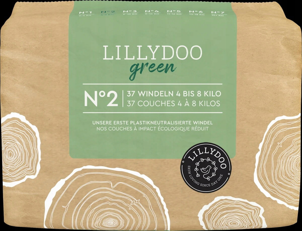 LILLYDOO w rozmiarze 2 (4 - 8 kg) wykonane są z niebielonej celulozy i zapakowane w papier, dzięki czemu są doskonałym przykładem produktu neutralnego dla klimatu.