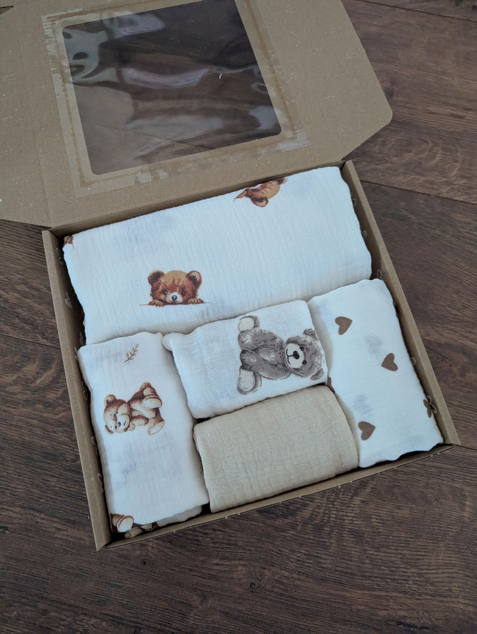 Pieluszki muślinowe otulacze ulewajki muślin wzory misie prezent pudełeczko