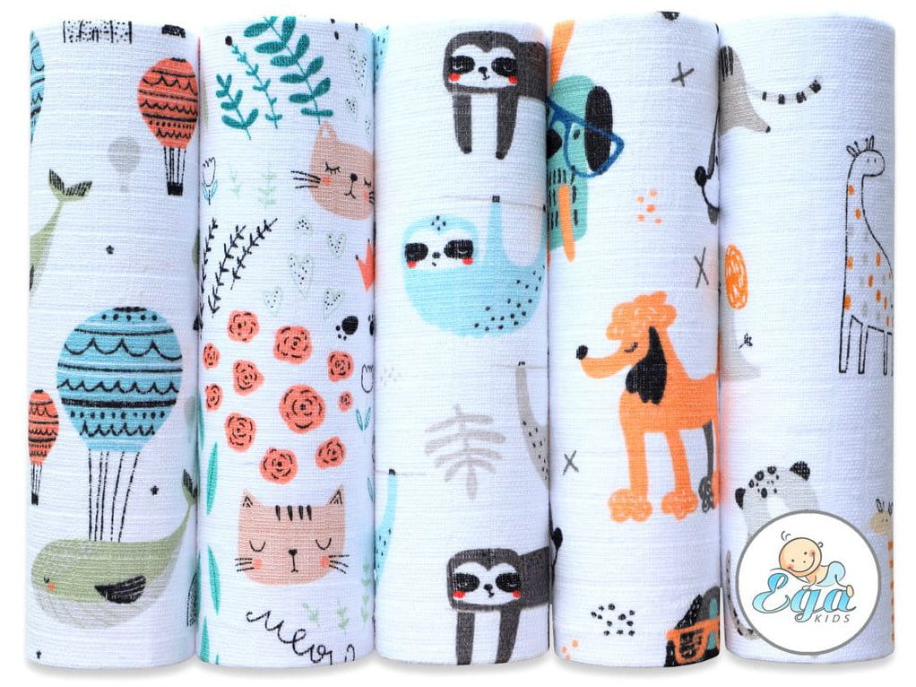 Zestaw 5 miękkich, chłonnych pieluszek w kolorowe wzorki. Idealne dopełnienie wyprawki.
