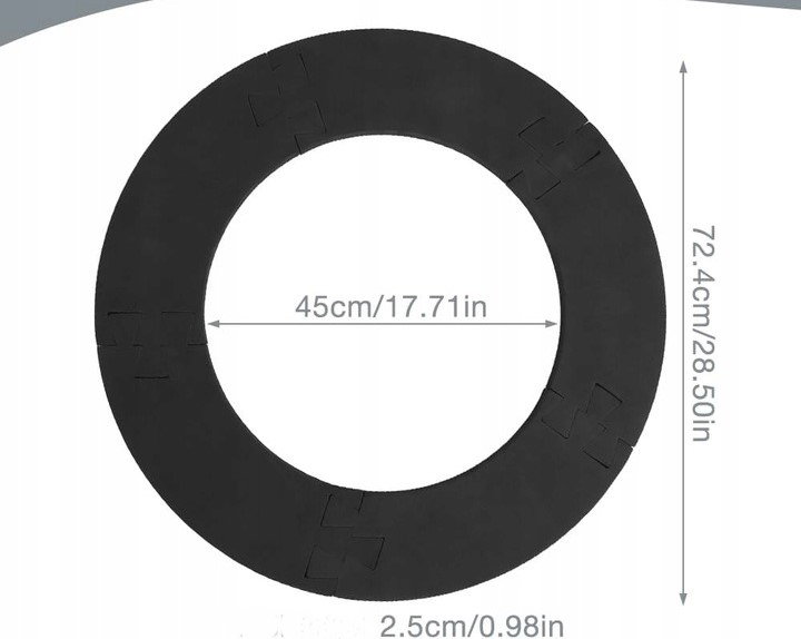 - Wymiary: obramowanie pierścienia do łapania rzutek obejmuje otwór wewnętrzny o średnicy 45 cm (17,75 cala), otwór zewnętrzny o średnicy 72,39 cm (28,5 cala) i grubość 2,54 cm (1 cal), dzięki czemu z łatwością pasuje do większości standardowych tarcz do rzutek.