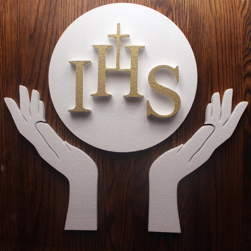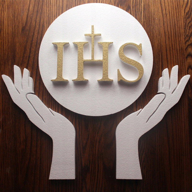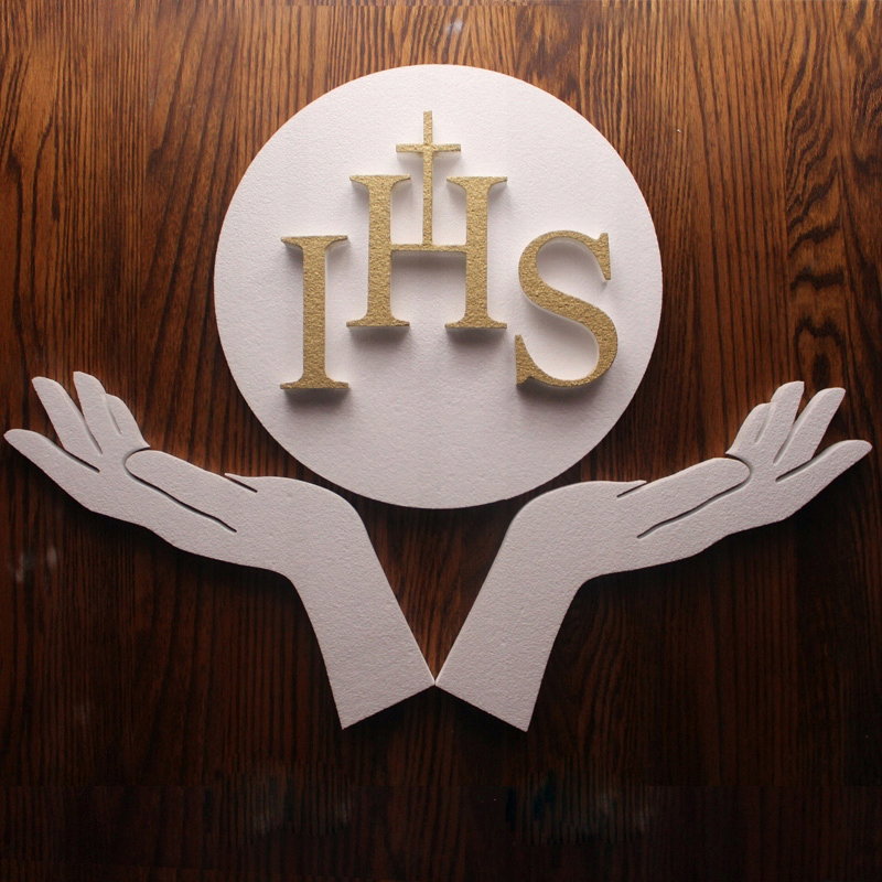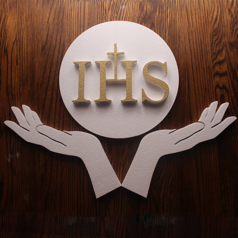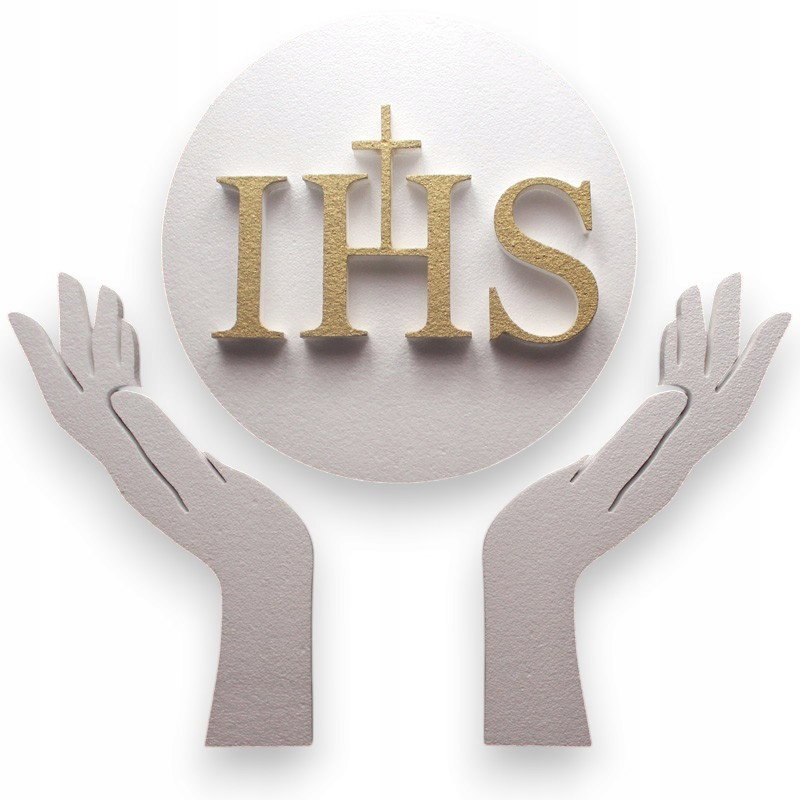 W skład tego produktu wchodzi hostia, 3 pomalowane z czoła na kolor złoty litery IHS oraz dłonie. Ze względów na bezpieczeństwo w transporcie litery nie są przymocowane do hostii, można je ułożyć wedle uznania i najlepiej jest przyczepić je szpilkami.