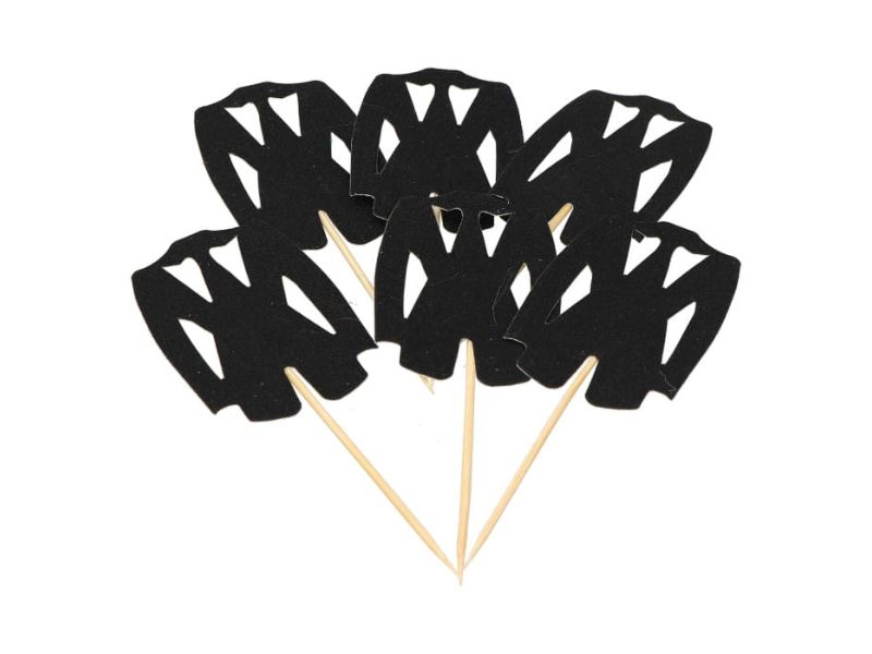 Pikery dekoracyjne w motywie "Garnitur". W zestawie znajduje się 6 sztuk. Idealne na babeczki lub ciasta, aby zaznaczyć motyw przewodni uroczystości.