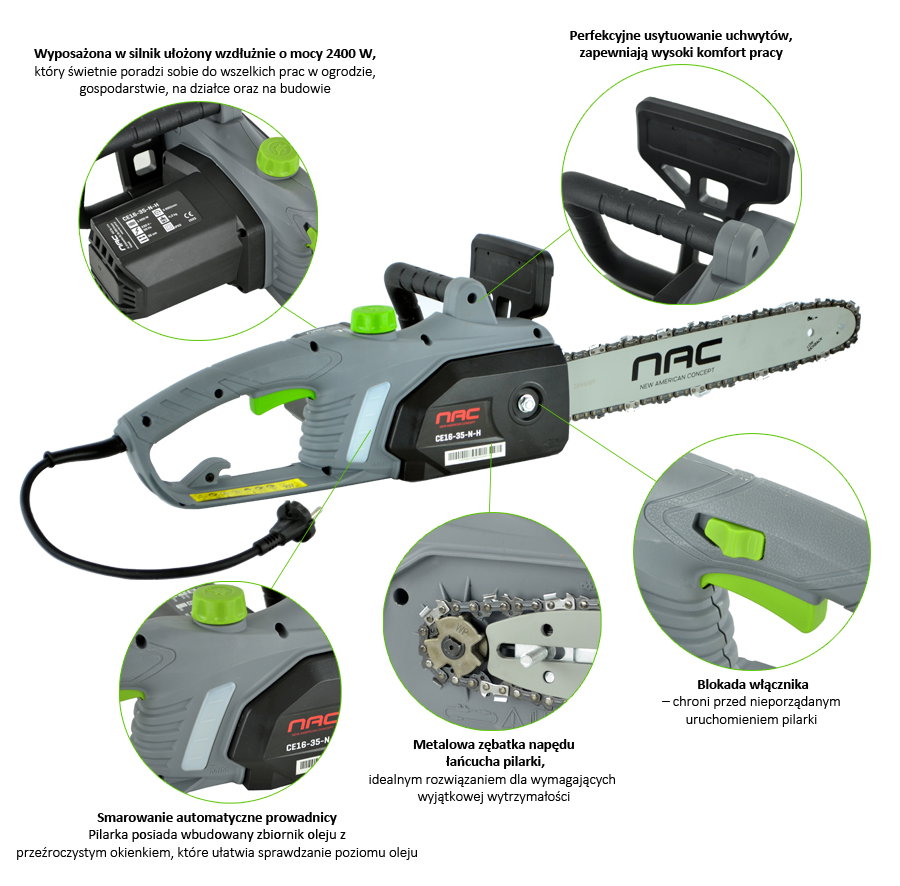 PIŁA ELEKTRYCZNA PILARKA ŁAŃCUCHOWA NAC CE16-35-N-H 1600 W PROWADNICA 35 CM