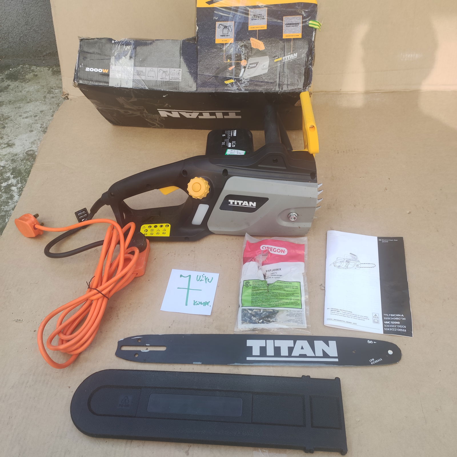 PILARKA ŁAŃCUCHOWA TITAN TTL758CHN 2000W 230V ELEKTRYCZNA 40CM Pilarka elektryczna z mocnym silnikiem i automatycznym smarowaniem łańcucha. Hamulec łańcucha aktywuje się w czasie krótszym niż 0,1 sekundy, zwiększając bezpieczeństwo operatora. Nadaje się do cięcia drewna opałowego. 2000W Niskoprofilowy łańcuch dłutowy Oregon z pełnym przeskokiem Prędkość łańcucha 14,5 m/s Wstępnie nasmarowane uszczelnienia Hamulec mechaniczny