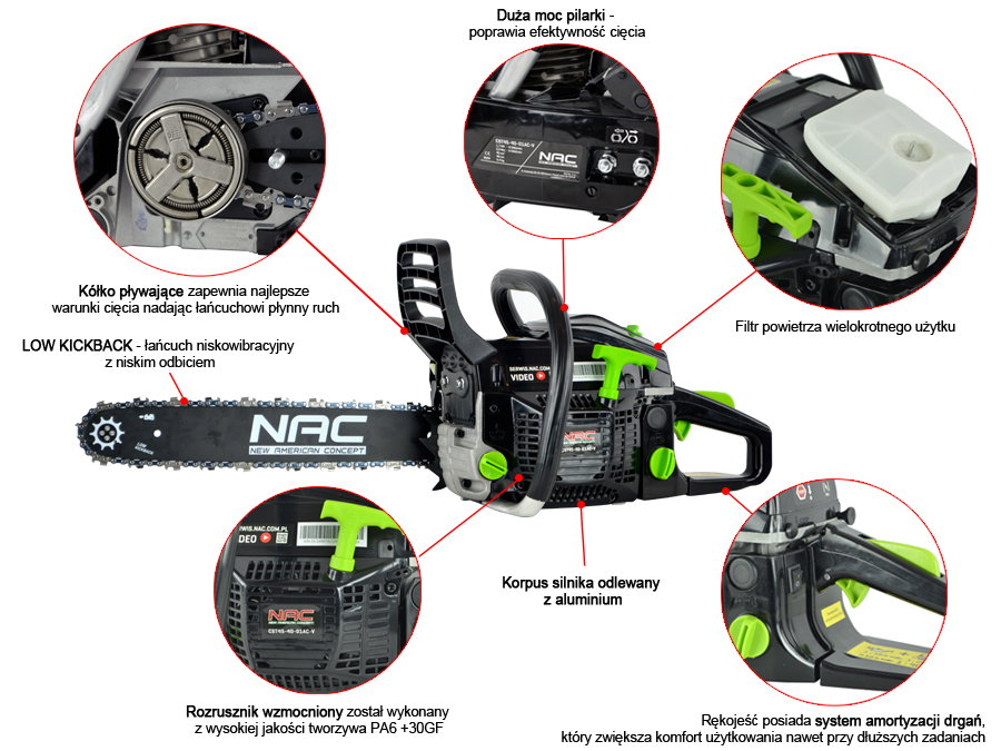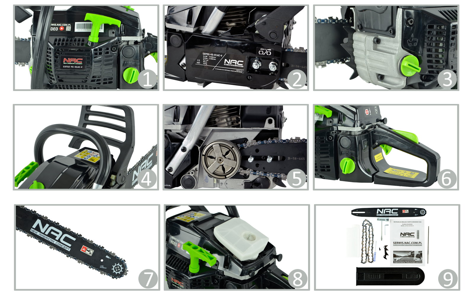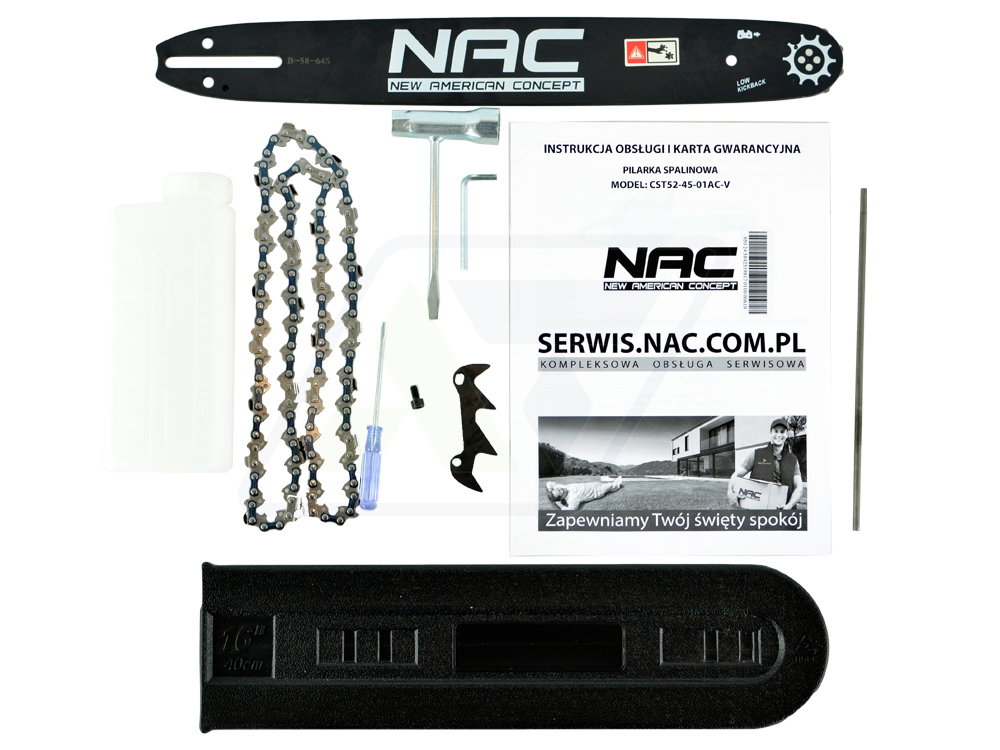 - W zestawie prowadnica i łańcuch firmy NAC, osłona łańcucha oraz zestaw kluczy
