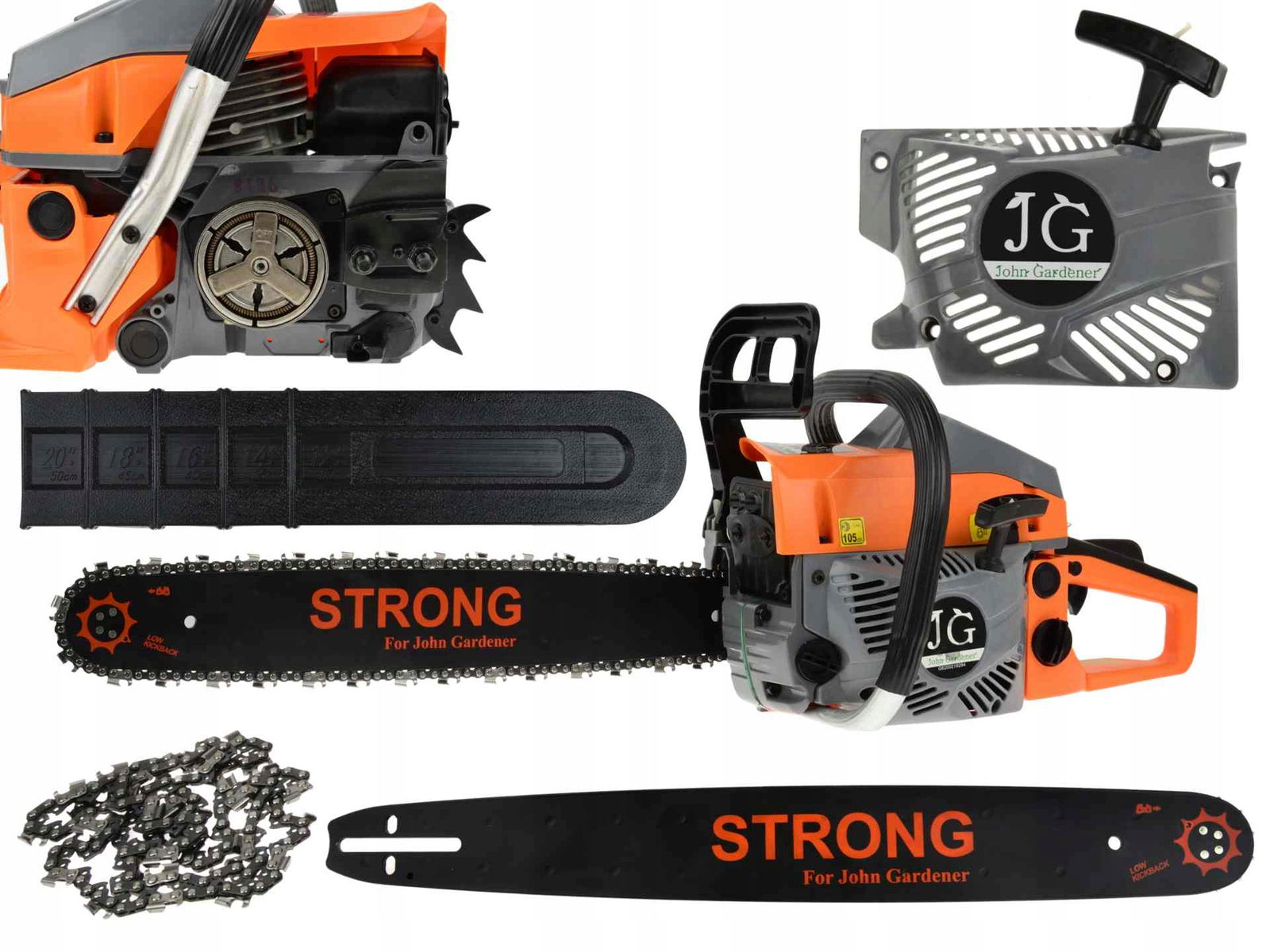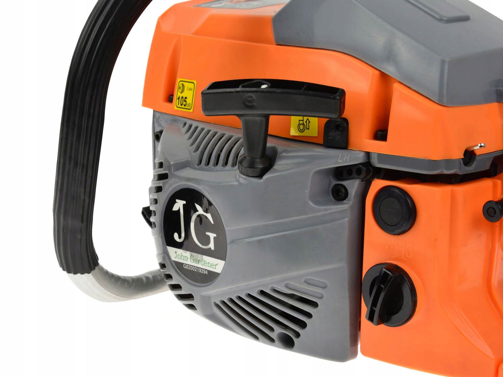Pilarka spalinowa renomowanej marki GEKO z serii narzędzi ogrodowych JOHN GARDENER. Wyposażona jest w silnik o pojemności 55 cm³, który zaraz po dotarciu (ok. 20 godzin pracy) pracuje na mieszance paliwowej 25:1 (1 litr benzyny na 40 ml oleju), taki stosunek ilości benzyny w stosunku do ilości oleju świadczy o tym, że silnik został starannie i precyzyjnie wykonany. Ponadto moc silnika osiągająca efektywne 3,1 KM zapewnia wydajną i efektywną pracę.