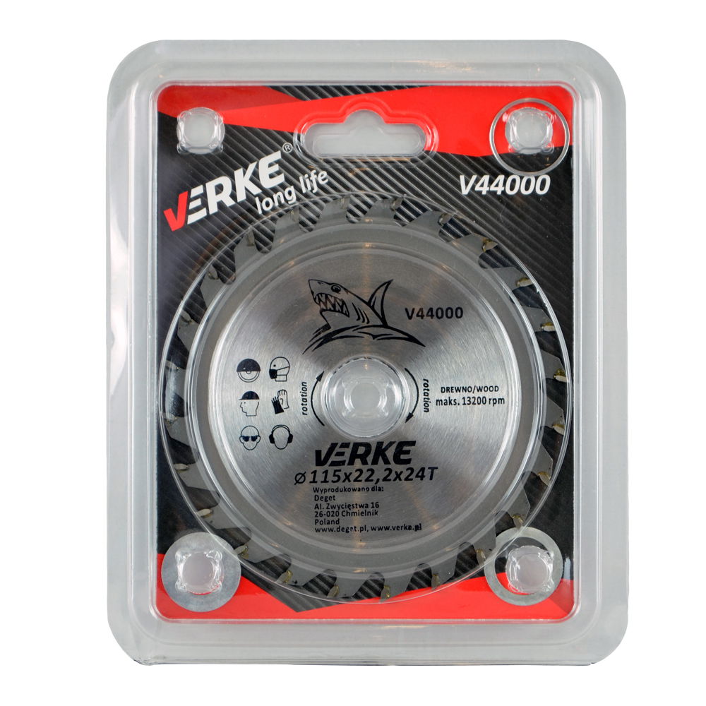 Tarcza widiowa do cięcia drewna marki Verke, o wymiarach 115x22,2 mm 24 zęby tnące.
