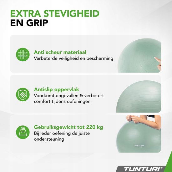 Piłka fitness Tunturi Anti Burst o średnicy 75 cm to praktyczne i uniwersalne akcesorium do ćwiczeń w domu, klubie fitness czy biurze. Dzięki systemowi Anti Burst i antypoślizgowej powierzchni zapewnia stabilność, bezpieczeństwo i komfort. Idealna do jogi, pilatesu, rehabilitacji oraz jako alternatywa dla krzesła biurowego.