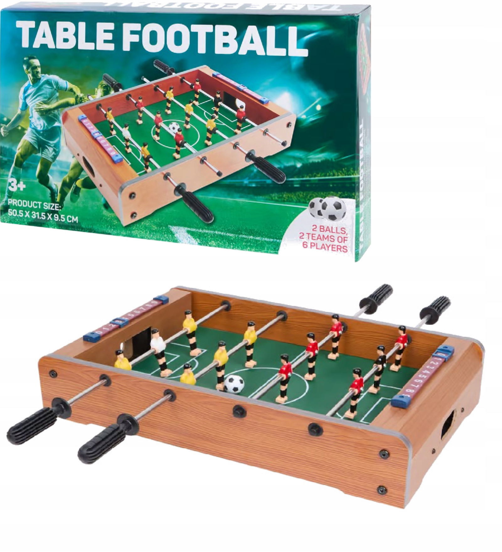 Zestaw zawiera dwie drużyny - czerwoną i żółtą, każda z sześcioma graczami, w tym bramkarzami. Poręczne uchwyty umożliwiają płynne poruszanie się po wyznaczonych trasach, pozwalając na podawanie piłki i skuteczne bronienie bramki. Ergonomiczne pokrętła doskonale leżą w dłoniach graczy, zapewniając komfort podczas zabawy. Twoje dziecko będzie miało możliwość stoczenia niesamowicie emocjonującego pojedynku. Na obu stronach boiska zamontowana jest taśma z numerami, umożliwiająca zliczanie bramek. Rozpocznij zawody i walcz o miano mistrza piłki nożnej!
