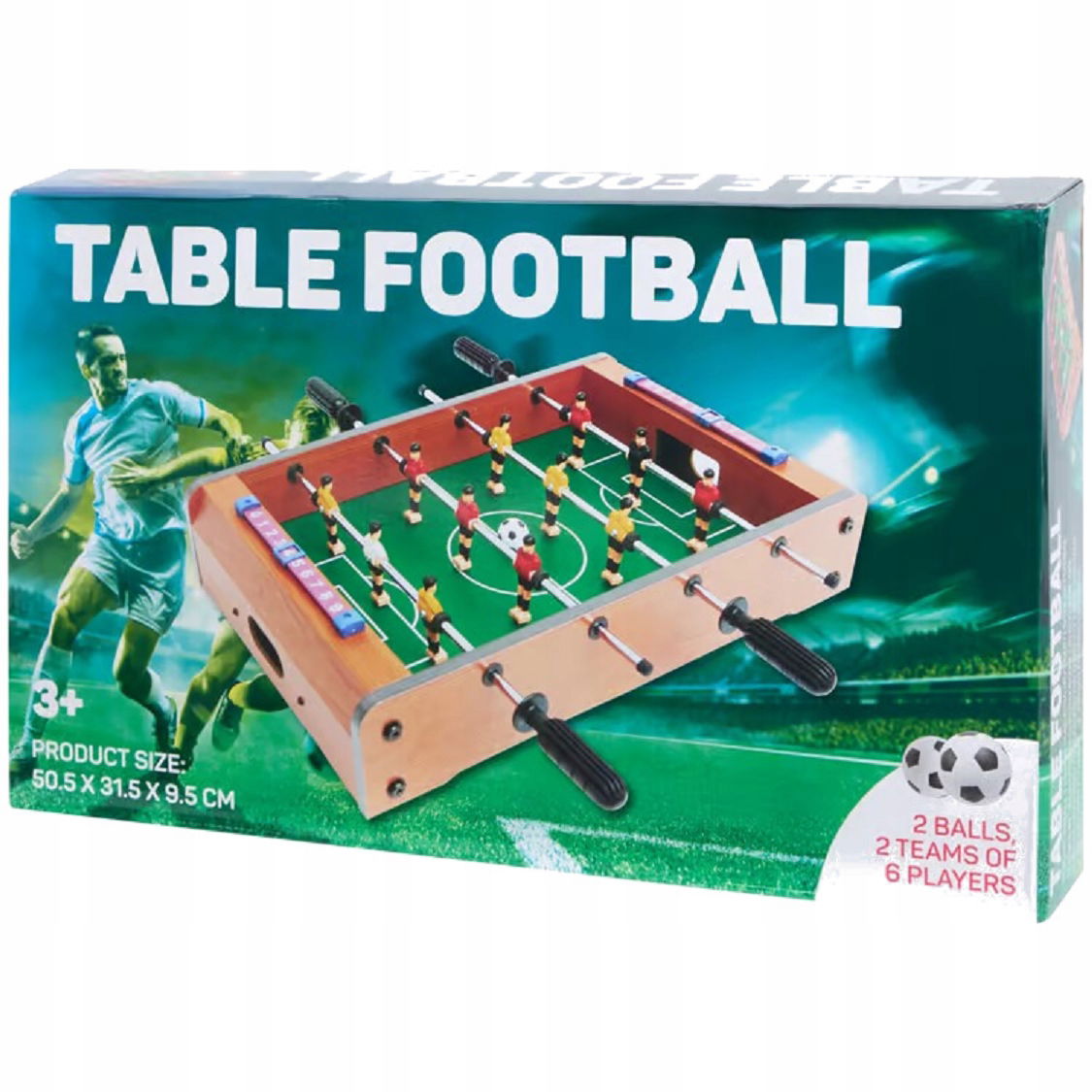 Zestaw zawiera dwie drużyny, po sześciu graczów. Poręczne uchwyty umożliwiają płynne poruszanie się po trasach. Dziecko może stoczyć emocjonujący pojedynek. Boisko z taśmą do liczenia bramek. Kompaktowy rozmiar pozwala na grę w małych pomieszczeniach.
