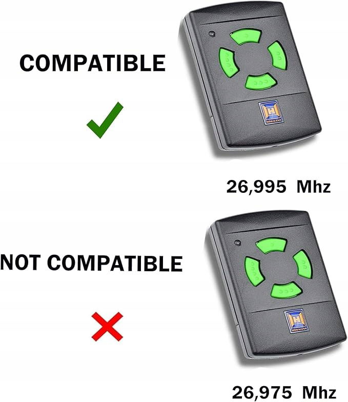 Ten pilot nie jest oryginalny, jest kompatybilny tylko z zielonymi przyciskami 26,695 MHz Hormann HS1, HS2, HS4, HSM2, HSM4, HSE2, HSZ1, HSZ2, HSP4, HSP4-C, HSD2-A, HSD2-C, HSD2-C.