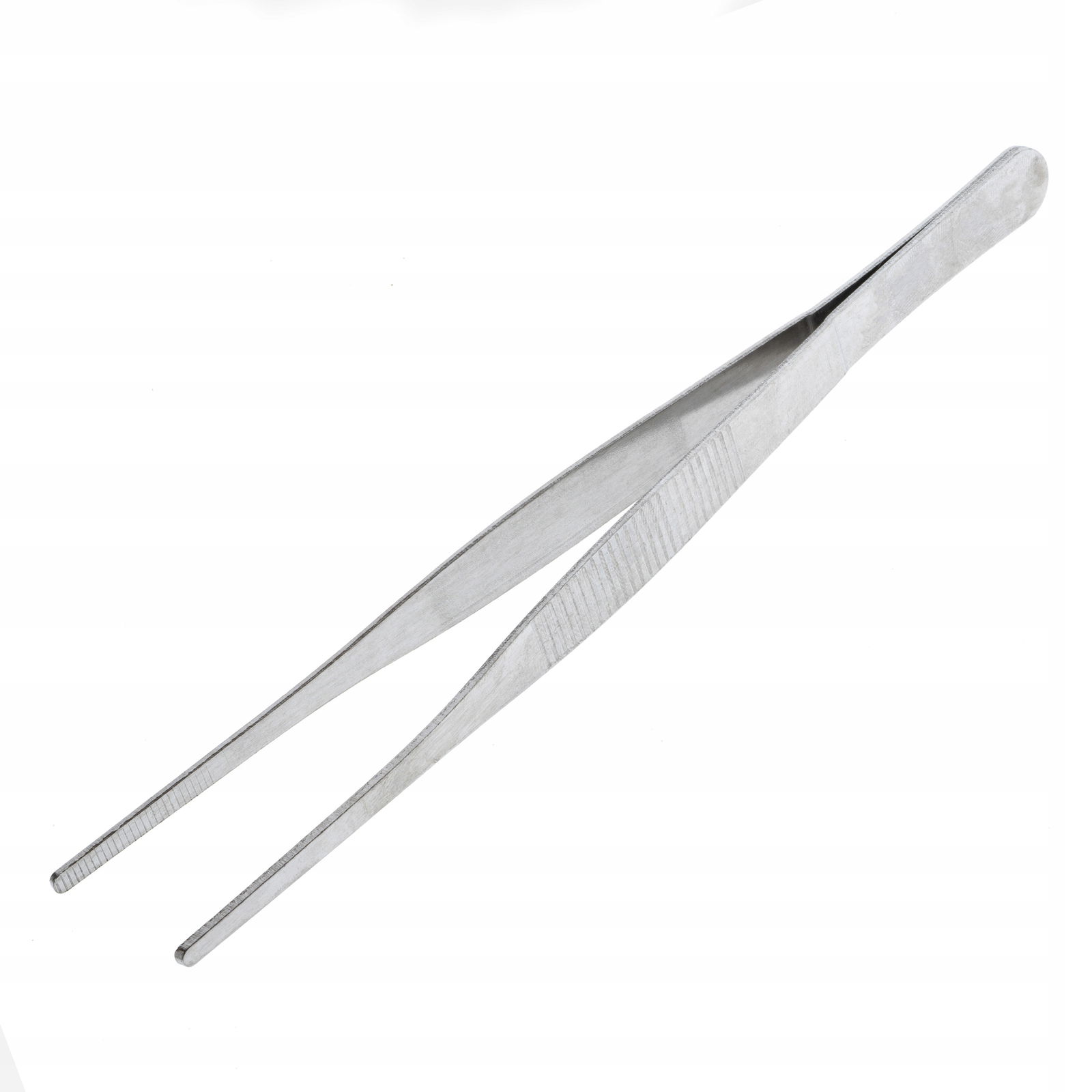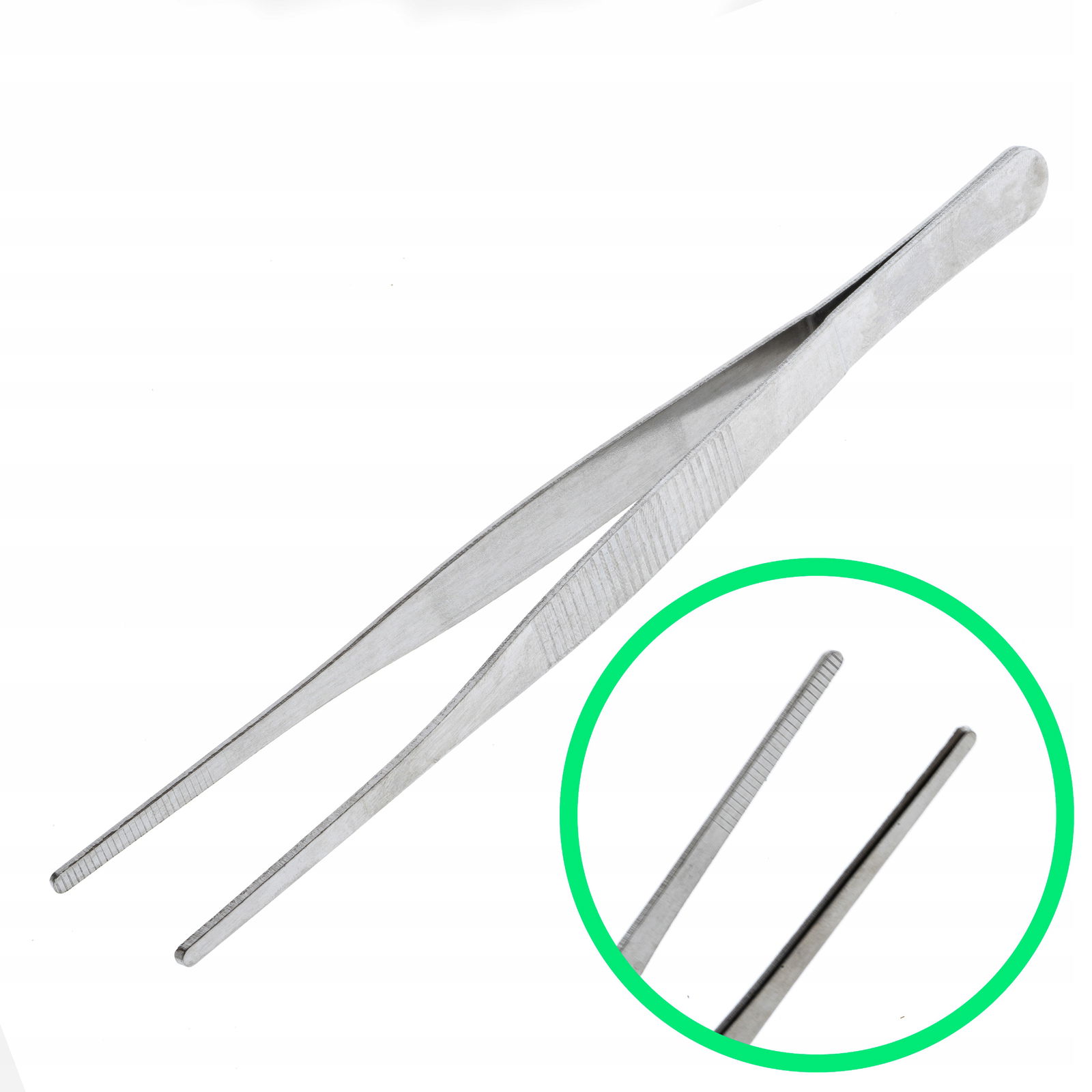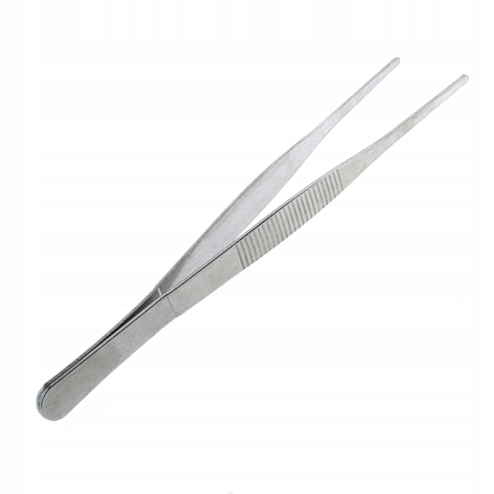 Pęseta pinceta laboratoryjna ze stali nierdzewnej, długość 160 mm. Końcówki zaokrąglone i proste. W części chwytowej znajduje się ząbkowanie zapobiegające wyślizgiwaniu się narzędzia podczas pracy.