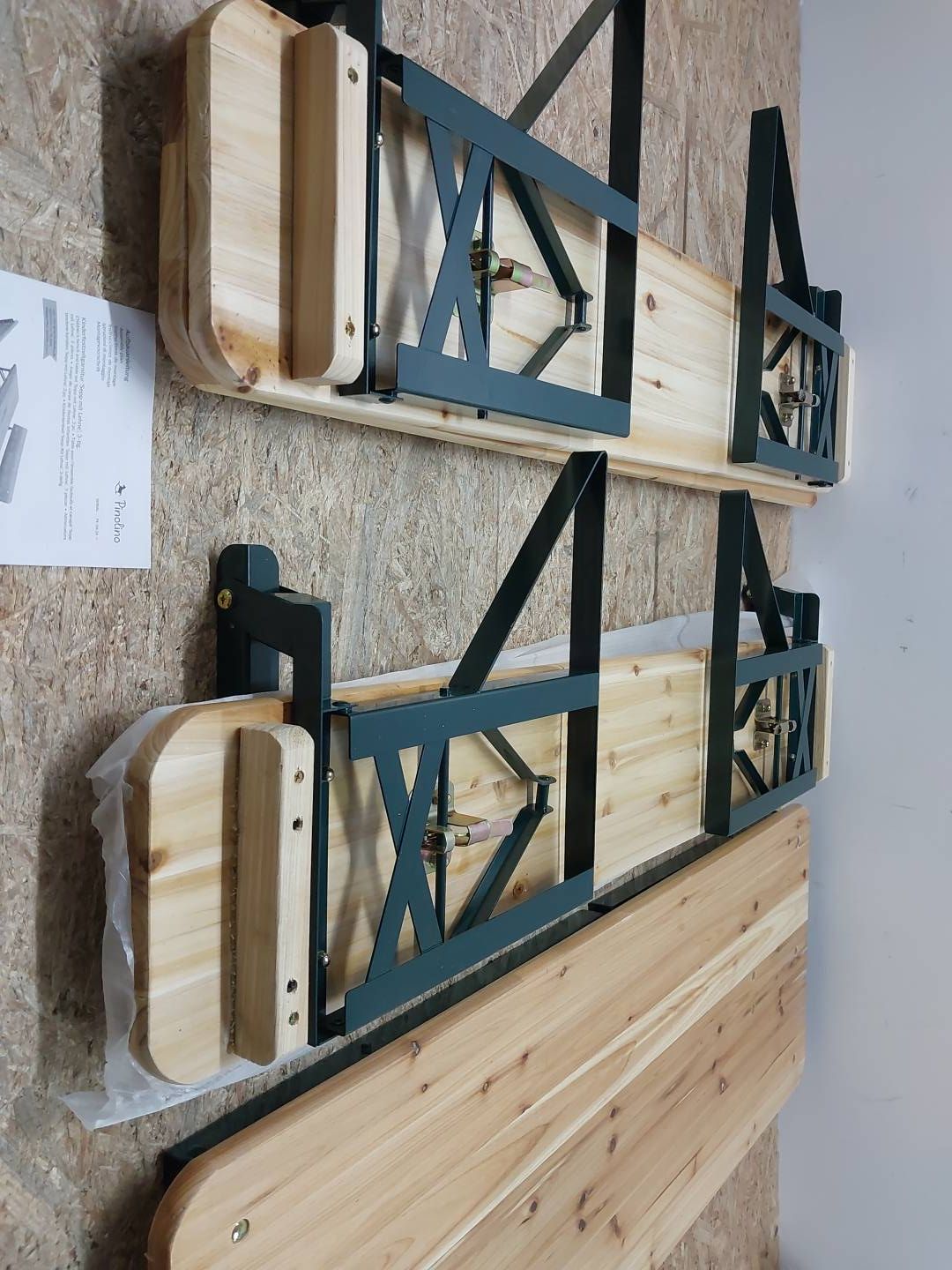 Wymiary stołu: szerokość 109 cm, głębokość 40 cm, wysokość 53 cm Wymiary ławki: szerokość 109 cm, głębokość 36 cm, wysokość 62 cm Wysokość siedziska: 33 cm