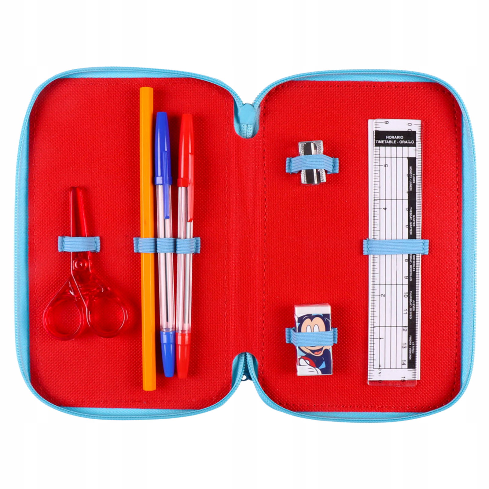 Praktyczny i w pełni wyposażony piórnik szkolny z motywem Myszki Miki. Idealny do szkoły podstawowej – wszystko w jednym miejscu.