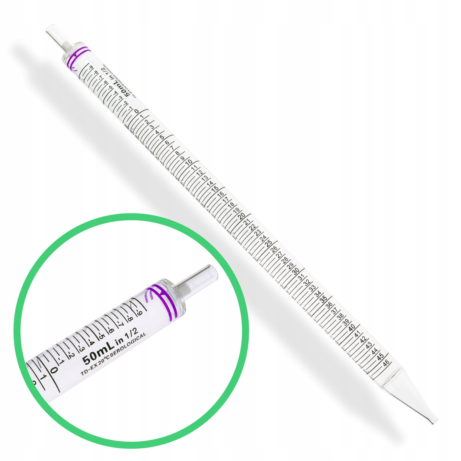 Pipeta serologiczna o pojemności 50 ml wykonana z przezroczystego polistyrenu (PS). Każda pipeta jest pakowana indywidualnie w blister, co pozwala na zachowanie sterylnych warunków pracy. Skala została naniesiona bezpośrednio na powierzchni pipety i oznaczona fioletowym pierścieniem identyfikacyjnym. Produkt wolny od DNaz, RNaz, cytoksyn i pirogenów.