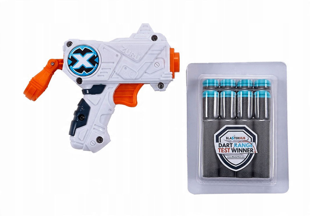 Zuru X-Shot posiada nowoczesny design w kolorze biało-granatowym z pomarańczowymi dodatkami.