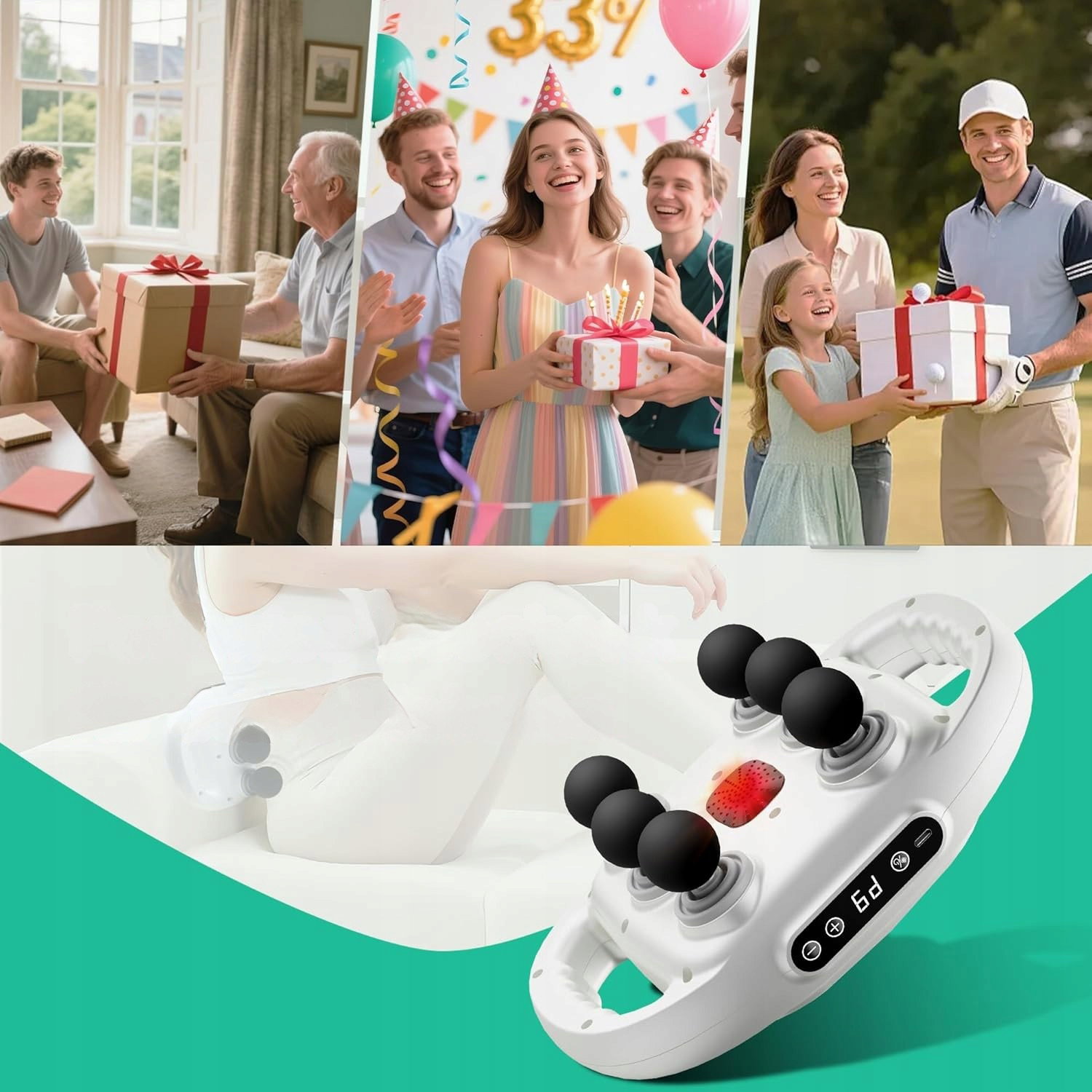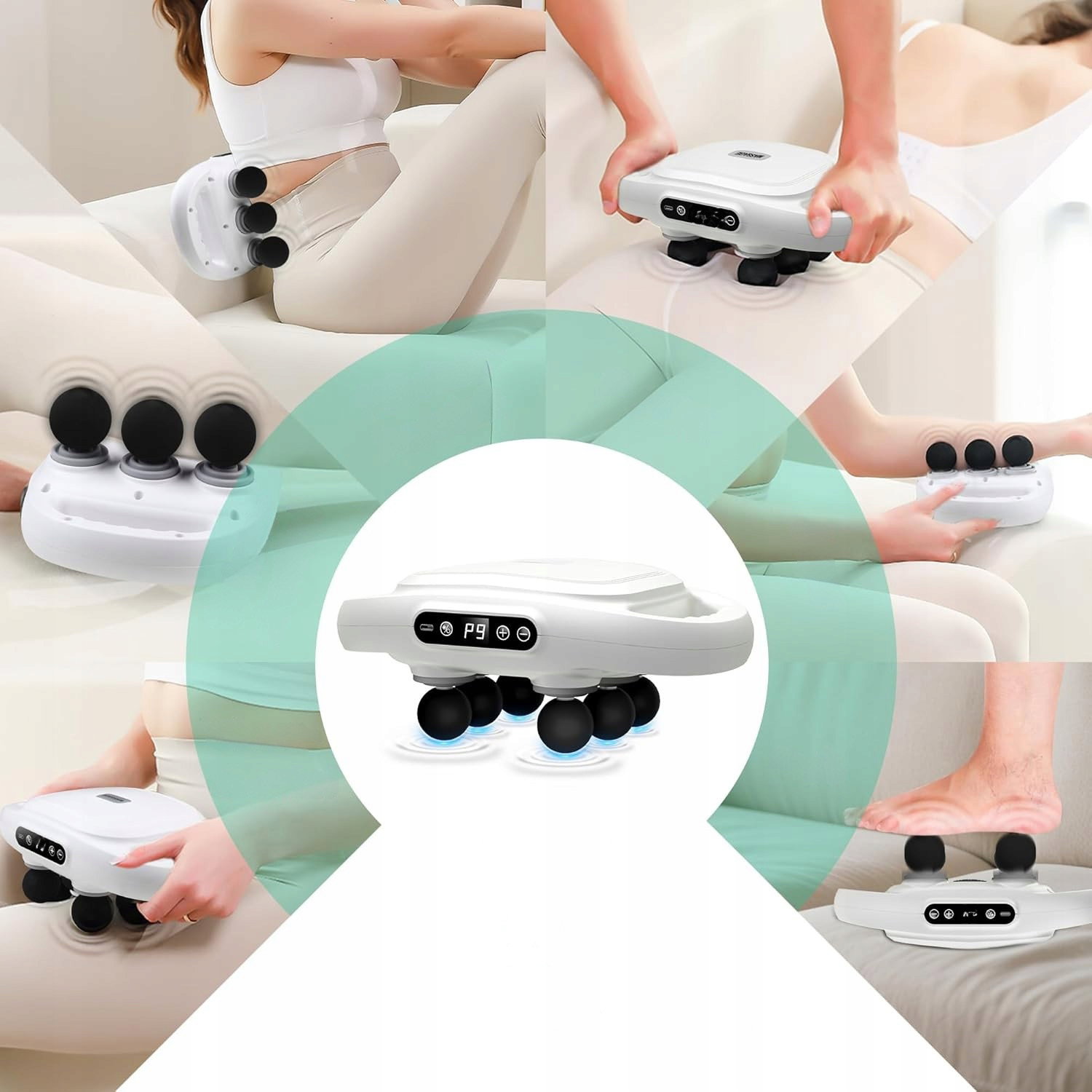 - 6 głowic – większa powierzchnia działania: zintegrowany system 6 ruchomych głowic obejmuje większy obszar niż klasyczne masażery punktowe. Takie rozwiązanie umożliwia równomierne rozprowadzanie impulsów wibracyjnych i skuteczniejsze rozluźnianie dużych grup mięśniowych. Konstrukcja sprzyja pracy nad plecami, udami oraz pośladkami bez konieczności częstego zmieniania pozycji urządzenia.