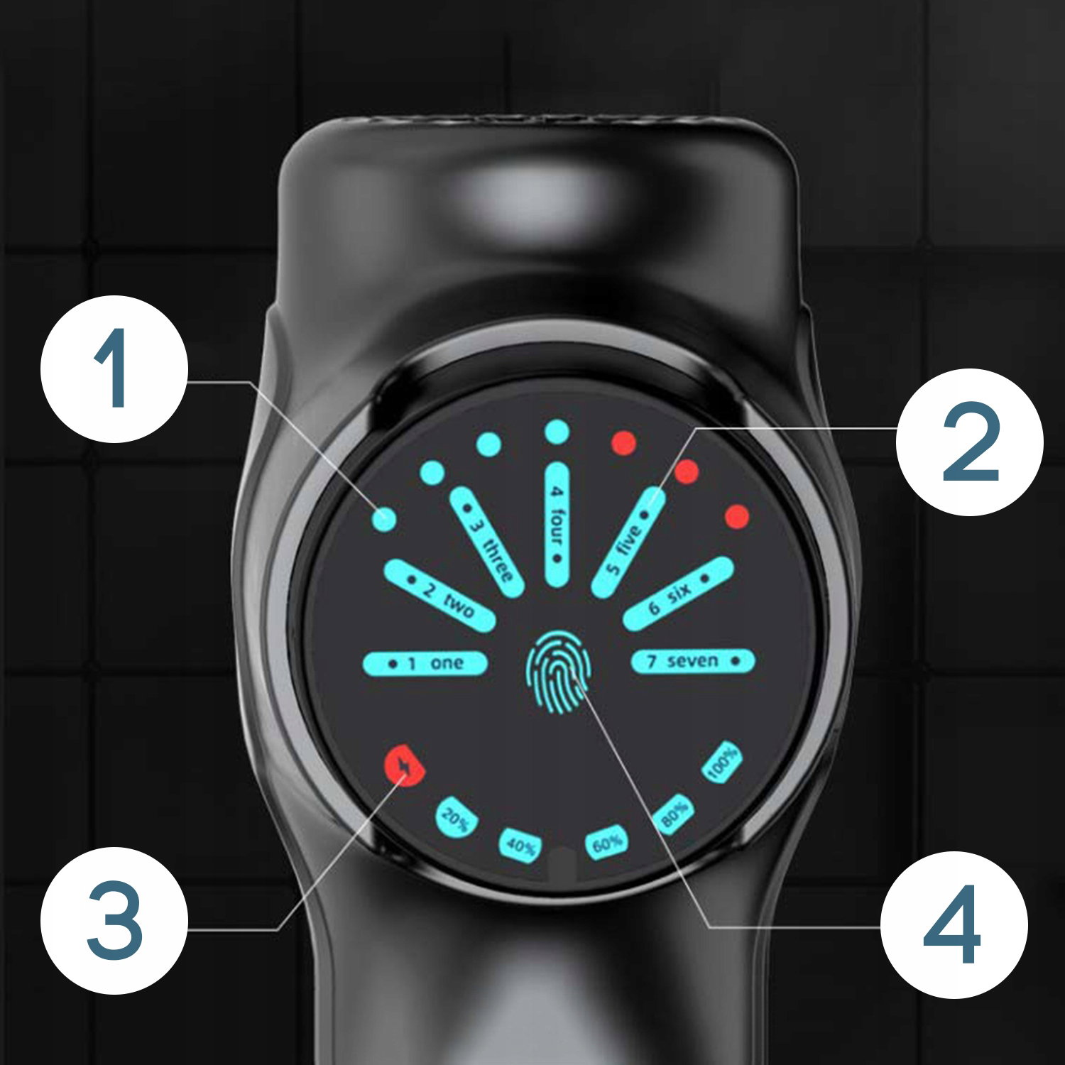 - Wskaźnik siły nacisku - czerwone kropki oznaczają, że powinieneś przykładać masażer do ciała z mniejszą siłą.
