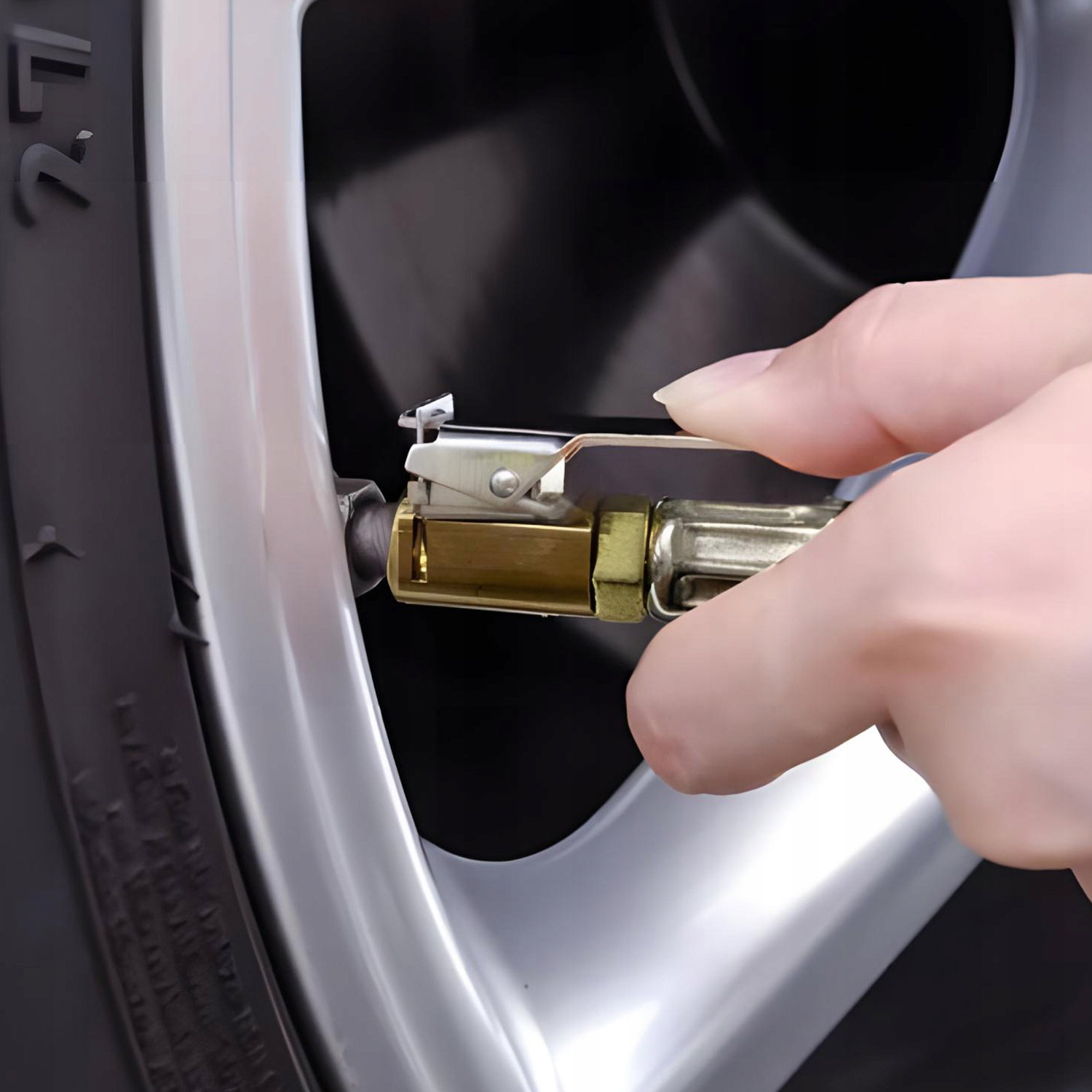 Podłącz pistolet do kompresora za pomocą szybkozłącza 1/4", przyłóż końcówkę do zaworu koła i kontroluj ciśnienie za pomocą wbudowanego manometru.