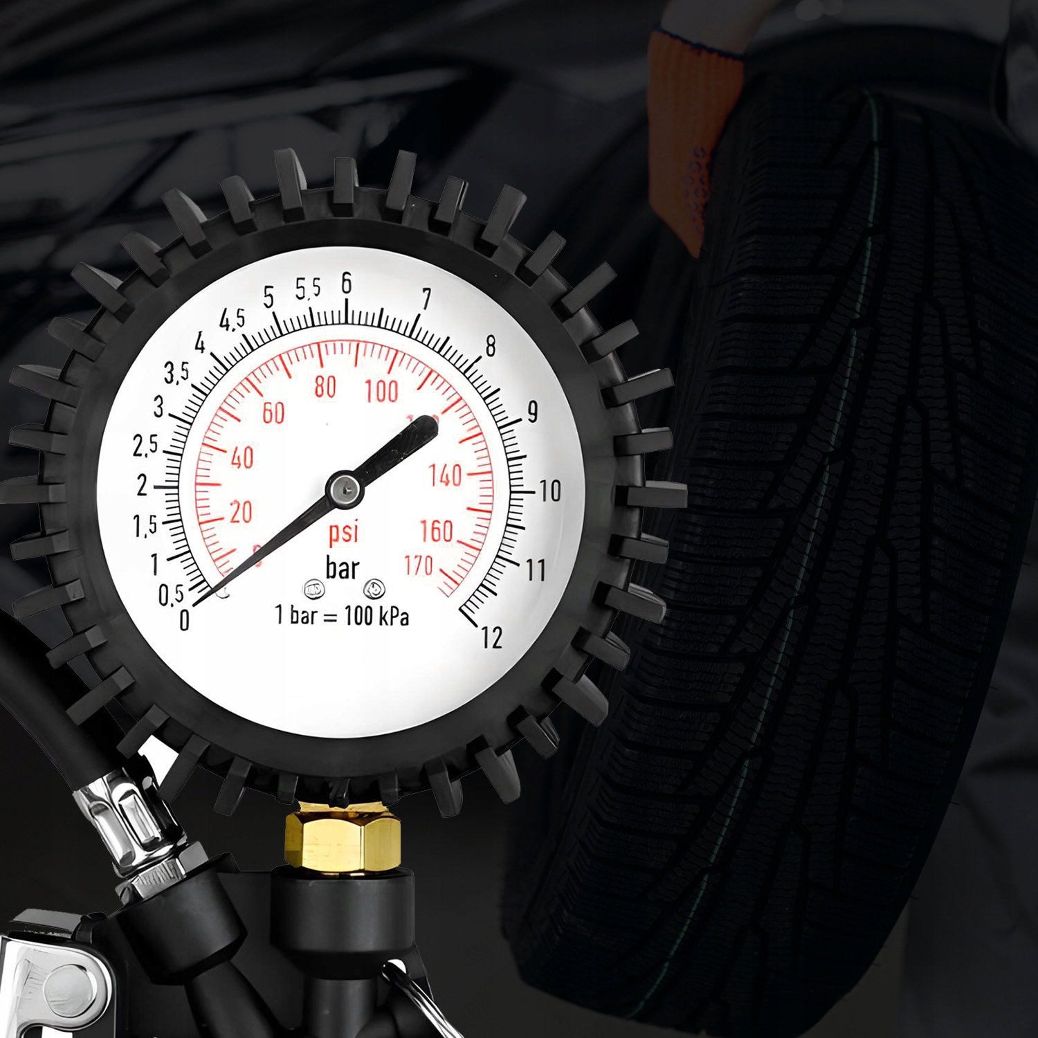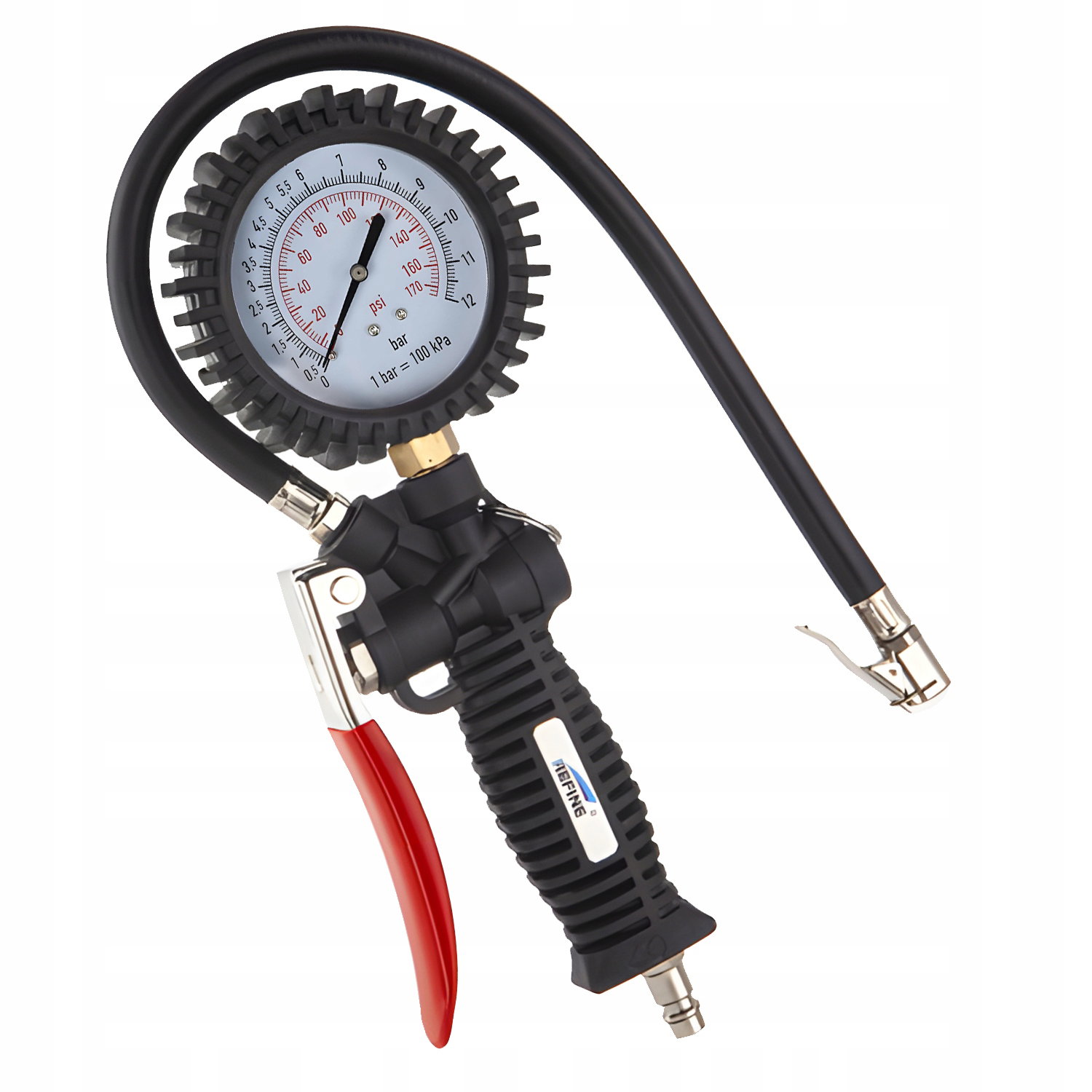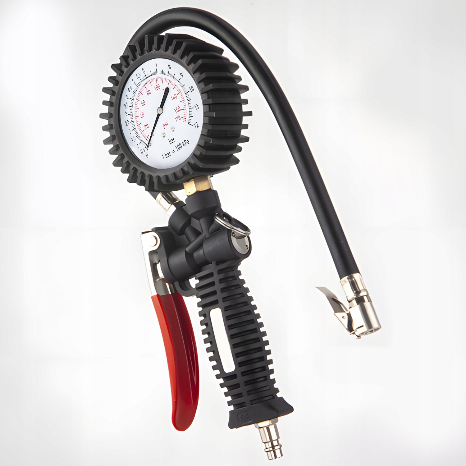 Pistolet RENEW FORCE® został wyposażony w czytelny manometr o dużej średnicy (10 cm), który umożliwia dokładny odczyt ciśnienia nawet do 12 bar. Skala podana w barach i psi sprawia, że praca z urządzeniem jest intuicyjna i precyzyjna – nie musisz zgadywać, ile powietrza znajduje się w oponie. Dzięki temu unikasz zarówno niedopompowania, jak i przeładowania.