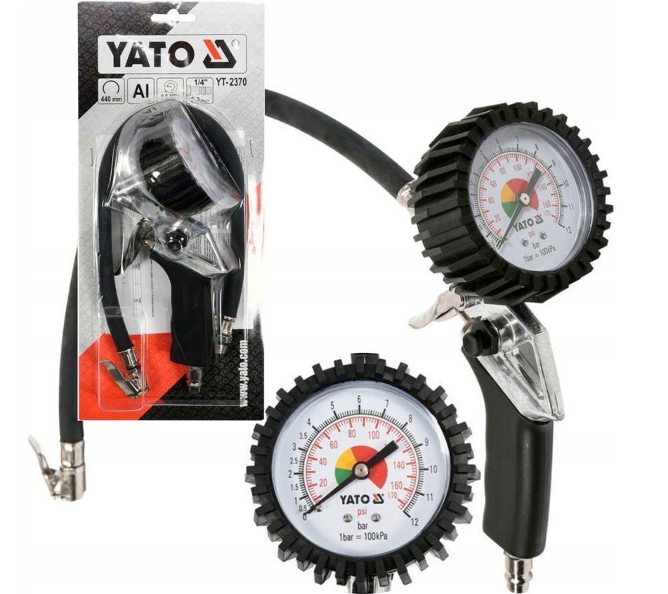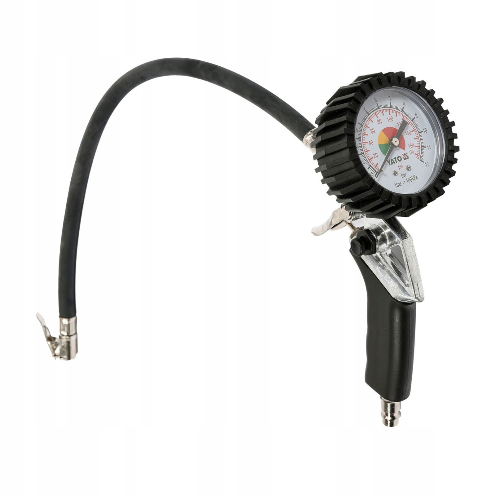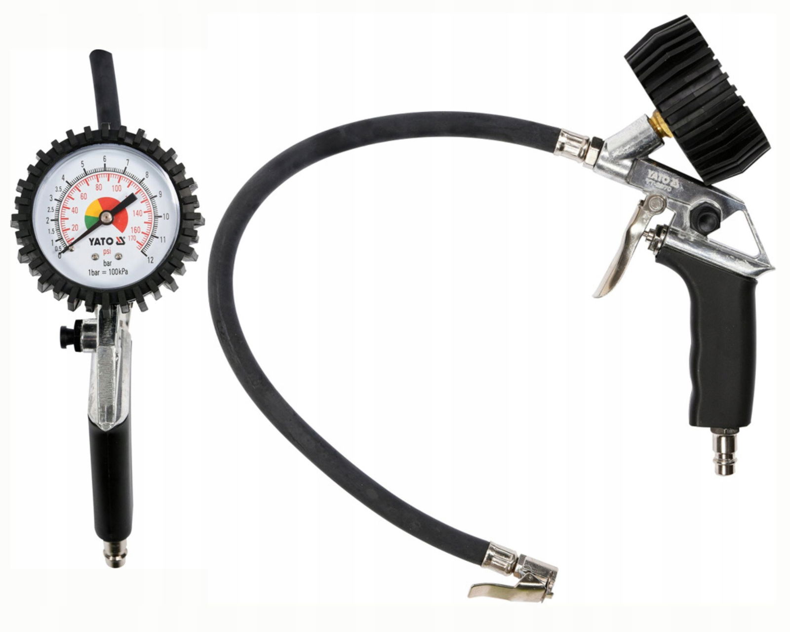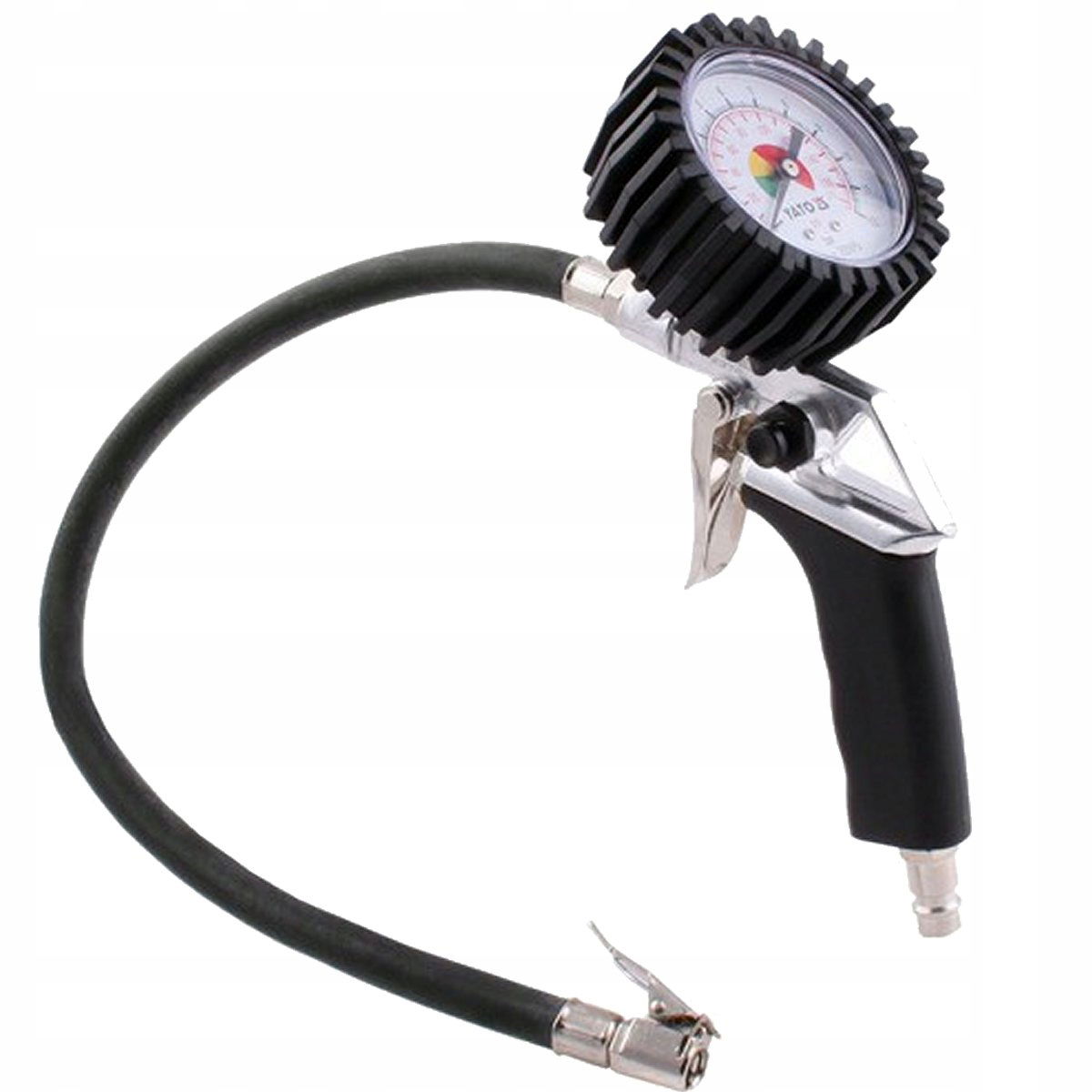 Profesjonalny pistolet do pompowania wyposażony w manometr, który umożliwia kontrolę ciśnienia powietrza w pompowanym produkcie oraz aluminiowy korpus z antypoślizgowym uchwytem.