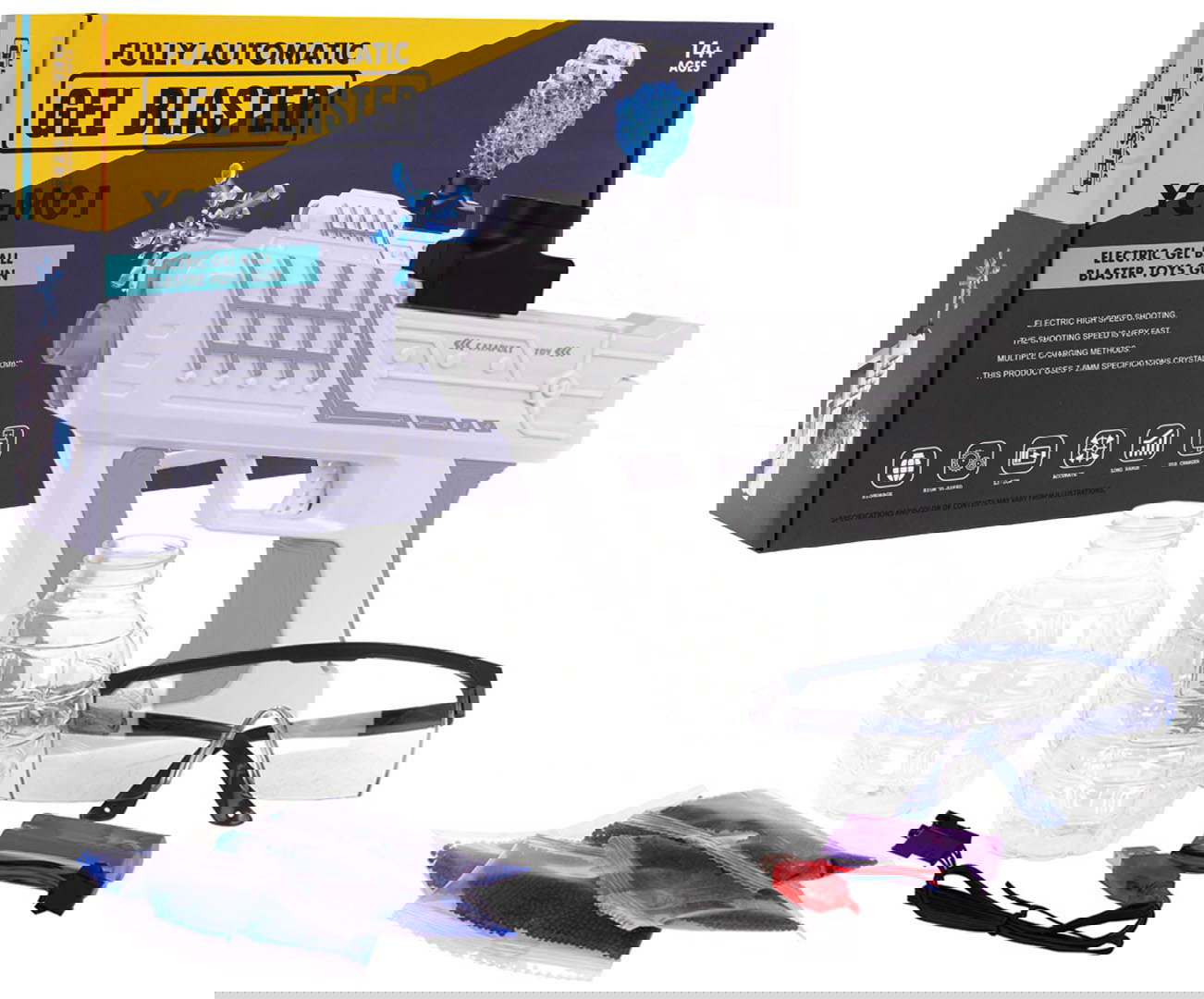 Automatyczny pistolet na kulki żelowe dla dzieci od 14-go roku życia. Pistolet wykonany został z najlepszej jakości plastiku i strzela automatycznie żelowymi kulkami. Użycie pistoletu jest bardzo proste. Wystarczy umieścić na górze pistoletu beczułkę z wcześniej przygotowanymi kulkami i nacisnąć spust. Pistolet będzie w sposób ciągły strzelać kulkami aż do wyczerpania zasobów. W zestawie znajdują się 4 woreczki z kulkami do przygotowania. Kulki przygotowuje się, zalewając je wodą i odstawiając na parę godzin. W zestawie znajdują się również okulary ochronne i beczułki na piłki żelowe.