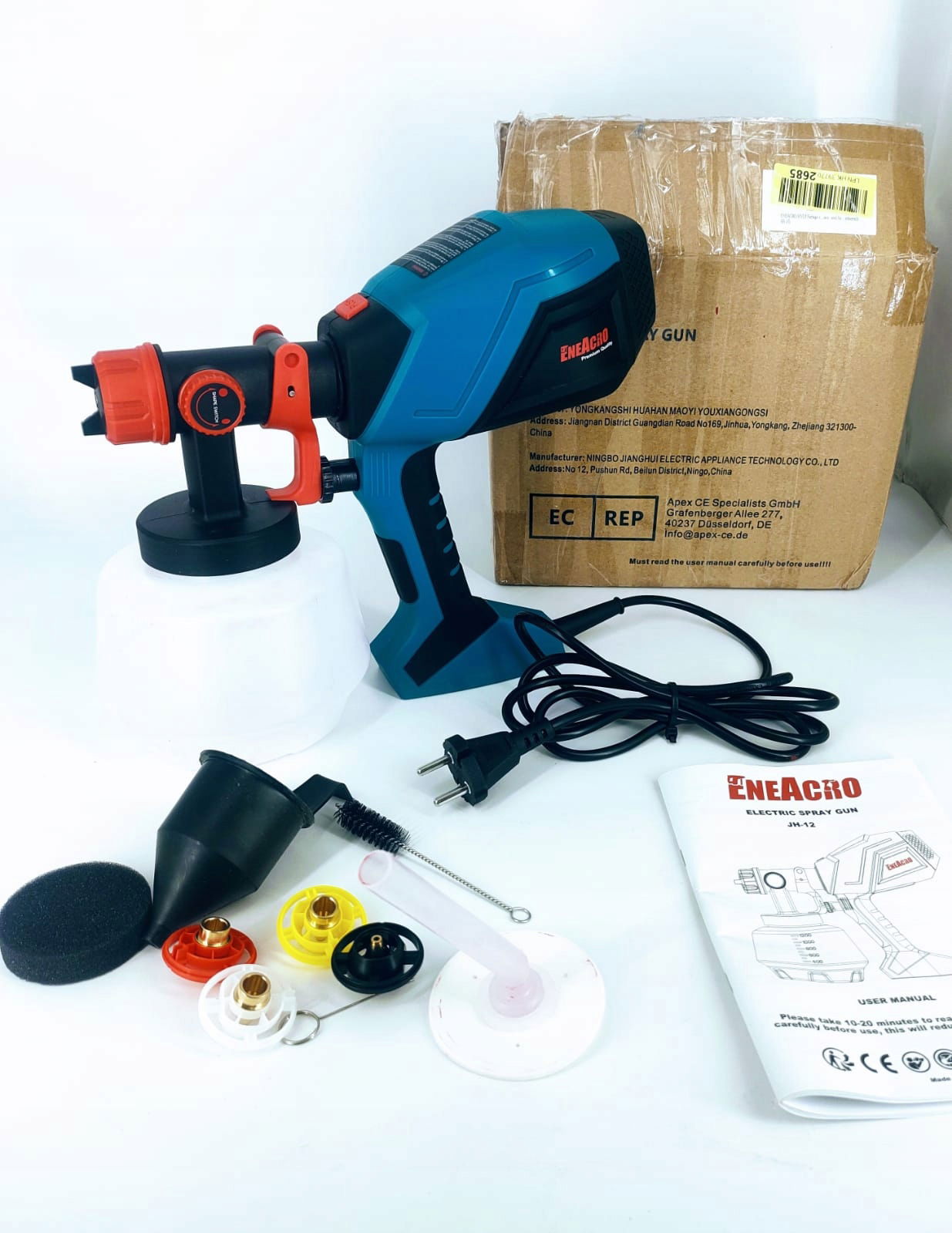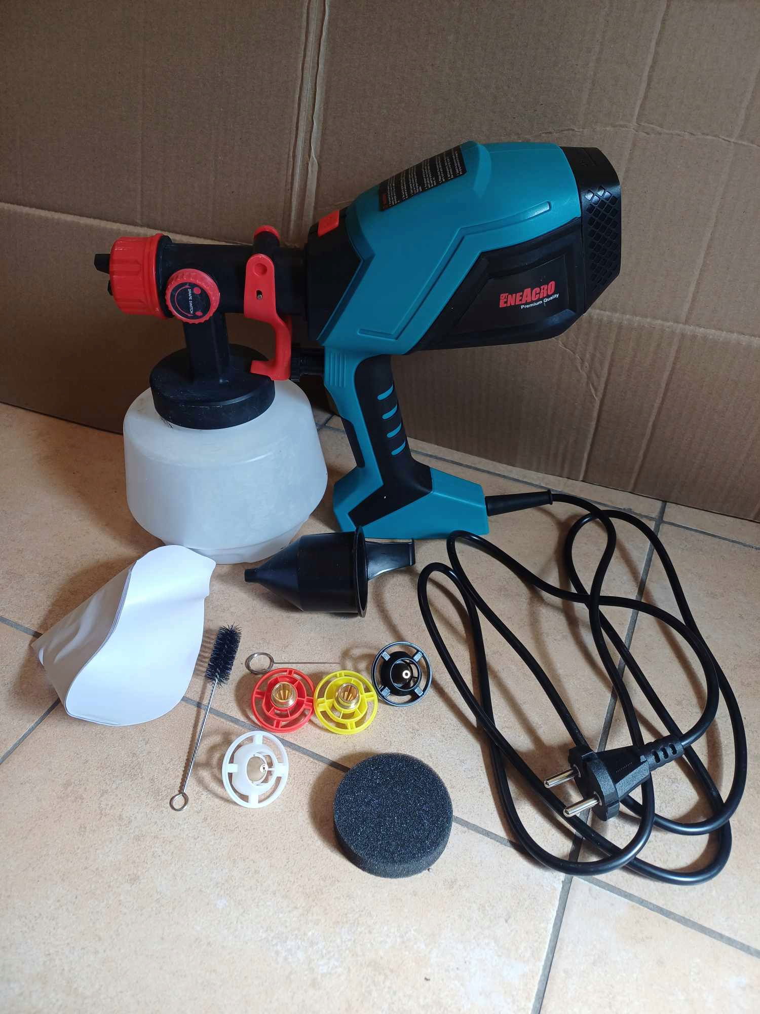 Pistolet natryskowy ENEACRO HVLP 700 W to Twoja nowa tajna broń w walce z czasem i nierównym malowaniem. Miedziany silnik, pojemnik 1200 ml i 5 mosiężnych dysz (1–3 mm) pozwolą Ci działać na pełnych obrotach – od malowania ścian po renowację mebli.