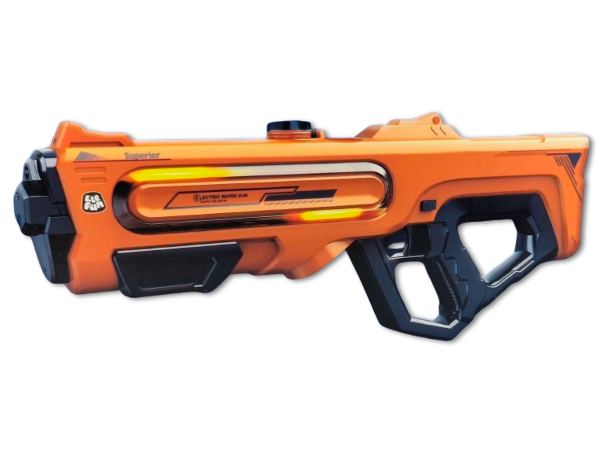 Duży elektryczny pistolet na wodę marki Elefun o długości 59cm przeznaczony dla dzieci od 6 roku życia. Pistolet posiada 2 tryby strzelania: automatyczny i ręczny. W trybie automatycznym możliwe jest strzelanie seriami lub pojedynczymi strzałami. Gdy naciśniemy przycisk strzału raz, pistolet odda jeden strzał, gdy spust przytrzymamy wówczas pistolet zacznie automatycznie strzelać wodą z określoną częstotliwością wydając przy tym dźwięki strzelania z efektami świetlnymi. W trybie manualnym pistolet nie ma efektów świetlnych i wymaga przeładowywania aby można było oddać strzał. Zabawka posiada dość duży zasięg i potrafi strzelać na odległość 8-10m. Pistolet jest wyposażony w 2 butelki, szara o pojemności 600ml oraz dodatkowa przezroczysta w górnej części pistoletu o pojemności 350ml. Górna butelka posiada uniwersalny gwint dzięki czemu pasują do pistoletu butelki np. po wodach mineralnych, co pozwala na przykręcenie do zabawki niemalże dowolnej butelki. Pistolet posiada również funkcję automatycznego ładowania wody, wystarczy, że włoży się jego lufę do naczynia z wodą i wciśnie się mały okrągły przycisk obok spustu. Pistolet jest zasilany akumulatorkiem litowo-jonowym 7,4V o pojemności 500mAh, który można naładować za pomocą dołączonego do zestawu kabla-USB.