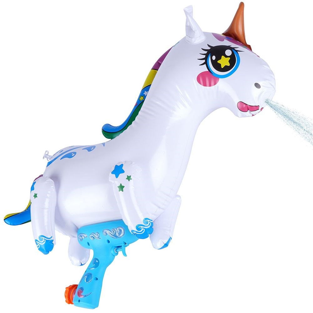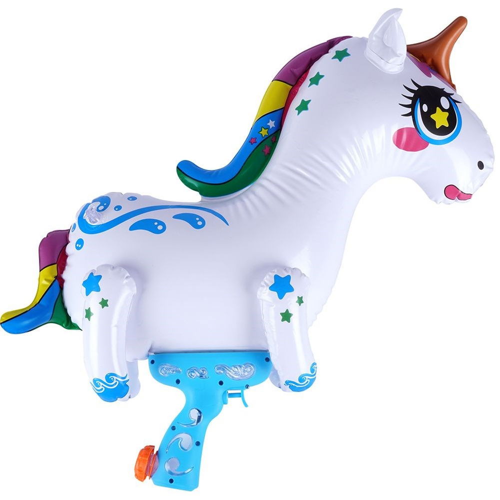ŚWIETNA ZABAWA - Nadmuchiwany pistolet na wodę w kształcie jednorożca, idealny do zabawy w wodzie i na świeżym powietrzu. W skład zestawu wchodzi: pistolet oraz pompka. Pistolet ma wymiary 55 x 18 x 58 cm.