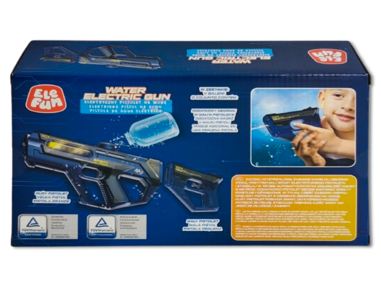 Elektryczny pistolet na wodę marki Elefun o długości 25-36cm przeznaczony dla dzieci od 6 roku życia. Pistolet posiada automatyczny tryb strzelania w którym możliwe jest strzelanie seriami lub pojedynczymi strzałami. Gdy naciśniemy przycisk strzału raz, pistolet odda jeden strzał, gdy spust przytrzymamy wówczas pistolet zacznie automatycznie strzelać wodą z określoną częstotliwością wydając przy tym dźwięki z efektami świetlnymi. Zabawka posiada dość duży zasięg i potrafi strzelać na odległość do 8. Pistolet jest wyposażony w przezroczystą butelkę z uniwersalnym gwintem dzięki czemu pasują do pistoletu butelki np. po wodach mineralnych, co pozwala na przykręcenie do zabawki niemalże dowolnej butelki. Pistolet jest tak skonstruowany, że w tylnej części posiada odpinany mniejszy pistolet z osobnym zbiornikiem na wodę (pistolet nieelektryczny). Pistolet zasilany jest 3 bateriami AA 1,5V (duże paluszki), które nie są dołączone do zestawu.