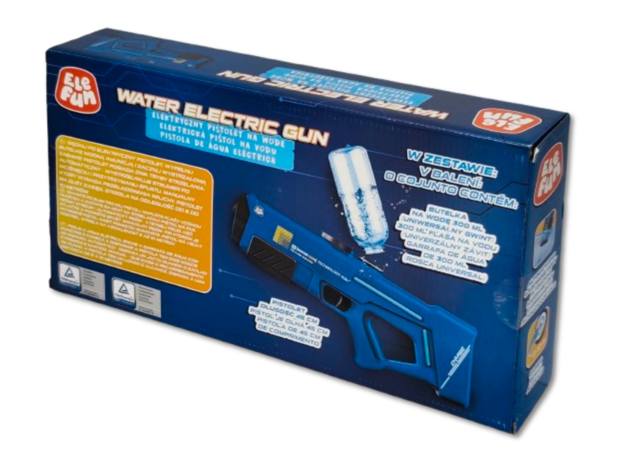 Elektryczny pistolet na wodę marki Elefun o długości 40cm przeznaczony dla dzieci od 6 roku życia. Pistolet posiada 2 tryby strzelania: automatyczny i ręczny. W trybie automatycznym możliwe jest strzelanie seriami lub pojedynczymi strzałami. Gdy naciśniemy przycisk strzału raz, pistolet odda jeden strzał, gdy spust przytrzymamy wówczas pistolet zacznie automatycznie strzelać wodą z określoną częstotliwością wydając przy tym dźwięki. W trybie manualnym pistolet wymaga przeładowywania aby można było oddać strzał. Zabawka posiada dość duży zasięg i potrafi strzelać na odległość 8-10m. Pistolet jest wyposażony jest w przezroczystą butelkę na wodę o pojemności 300ml z uniwersalnym gwintem dzięki czemu pasują do pistoletu butelki np. po wodach mineralnych, co pozwala na przykręcenie do zabawki niemalże dowolnej butelki. Pistolet posiada również funkcję automatycznego ładowania wody, wystarczy, że włoży się jego lufę do naczynia z wodą i wciśnie się mały okrągły przycisk obok spustu. Pistolet jest zasilany 4 bateriami AA 1,5V (duże paluszki), które nie są dołączone do zestawu.