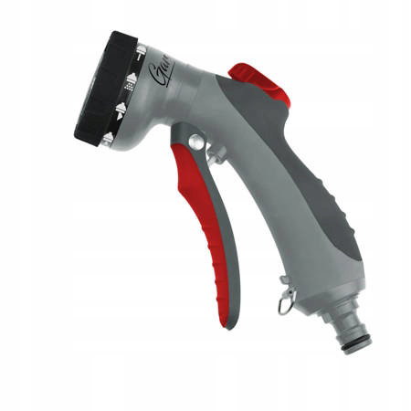 Zestaw do tworzenia systemów nawadniania czteroczęściowy. Składa się z pistoletu zraszającego 8 funkcyjnego z regulacją natężenia strumienia wody w pokrętle tylnym. Oprócz 8 kształtów strumienia wody (od silnie skupionej strugi do delikatnej mgiełki) posiada dodatkowo funkcję włącz/wyłącz (on/off trigger control) w spuście przednim. Pozwala to na obsługę pistoletu jedną ręką. Regulacja wypływu wody sterowana zaworem na górnej części pistoletu, dodatkowo posiada możliwość zablokowania wciśnięcia spustu, aby nie męczyć rąk. Obudowa pistoletu zraszającego wykonana została z połączenia wytrzymałego tworzywa ABS oraz wstawek z miękkiego tworzywa TPR zapewniającego doskonały chwyt nawet przy wilgotnej powierzchni. Zestaw zawiera przyłącze kranowe 3/4" z redukcją do 1/2", szybkozłączkę przelotową 1/2" oraz drugą szybkozłączkę typu STOP 1/2", pozwalającą na odłączanie końcówek roboczych bez konieczności zakręcania zaworu wody.
