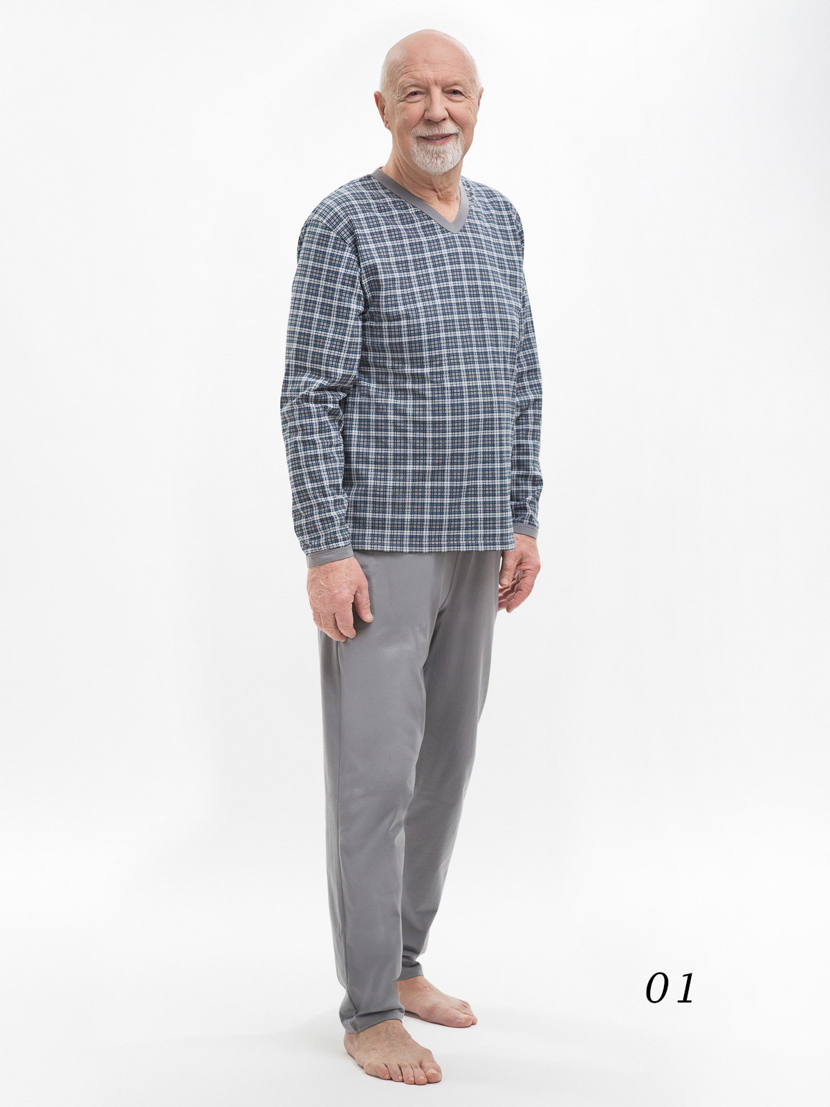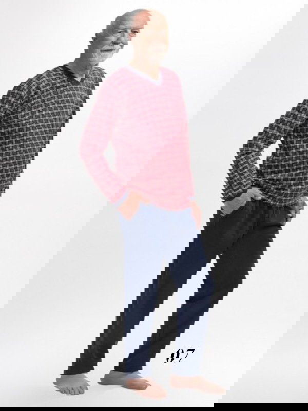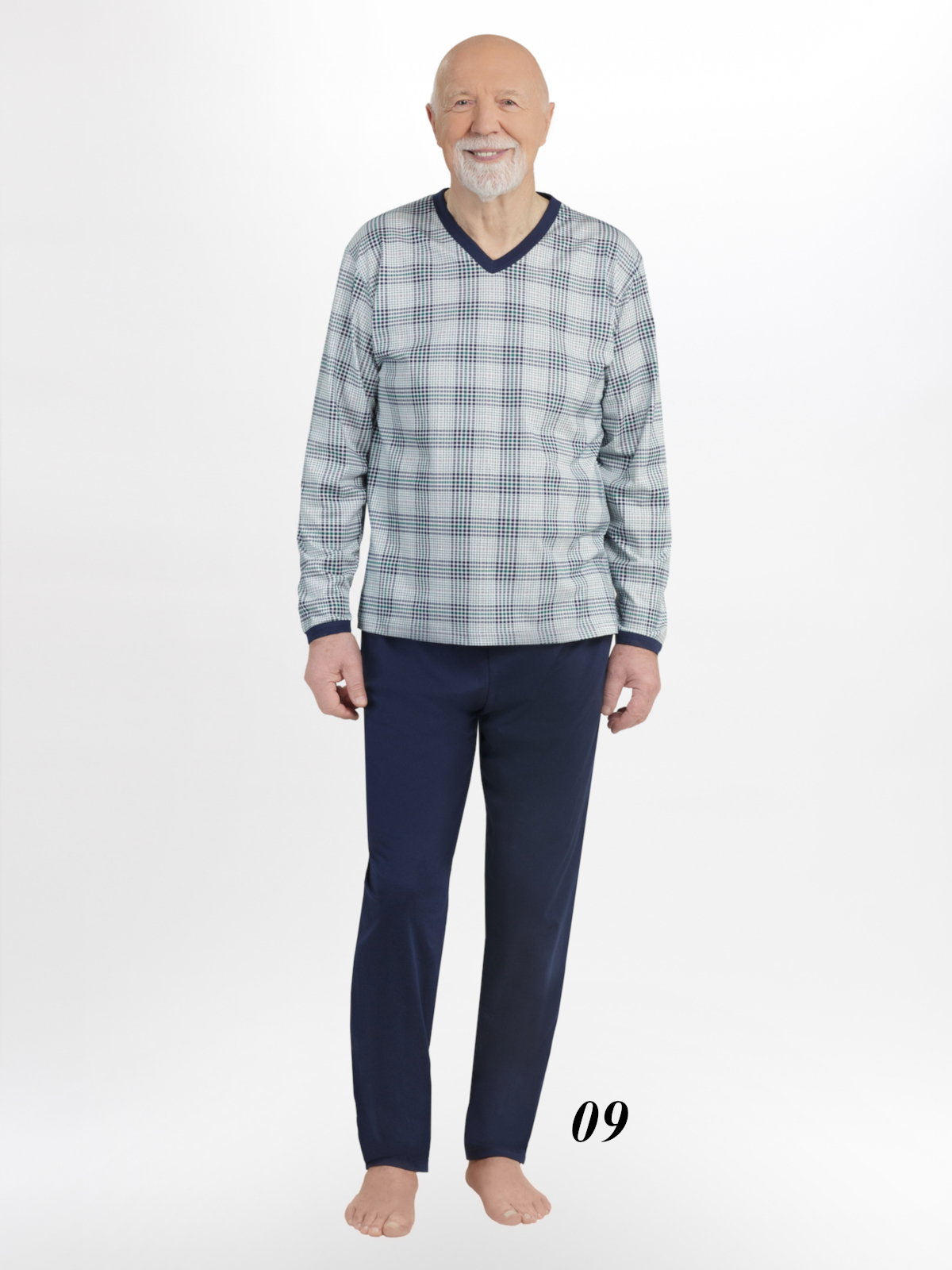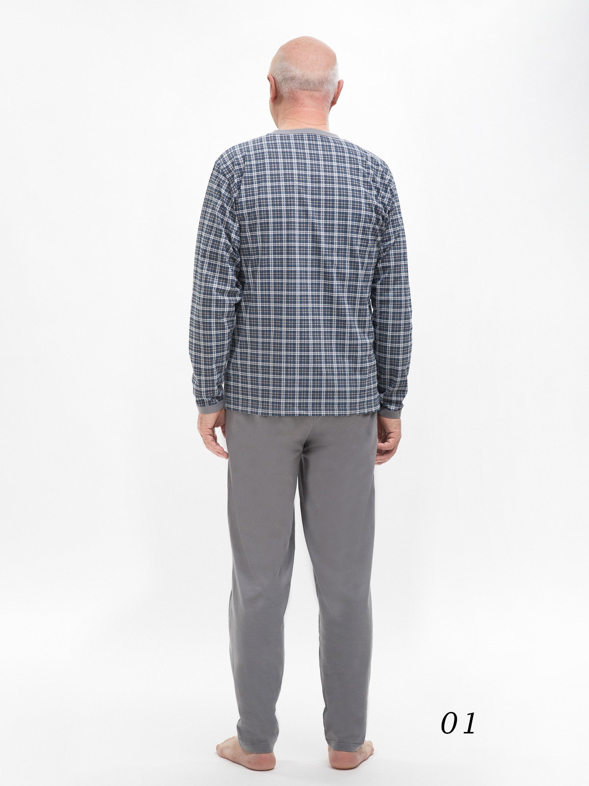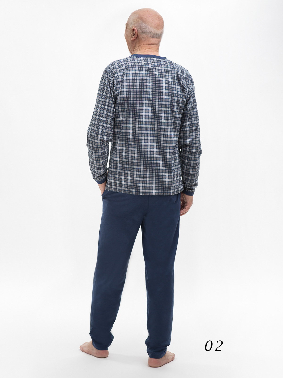 Piżama męska wykonana z wysokogatunkowej, przyjemnej bawełny W komplecie koszula z długim rękawem, we wzór w kratę, a także długie spodnie w jednolitym kolorze. Dostępna w dwóch wersjach kolorystycznych.