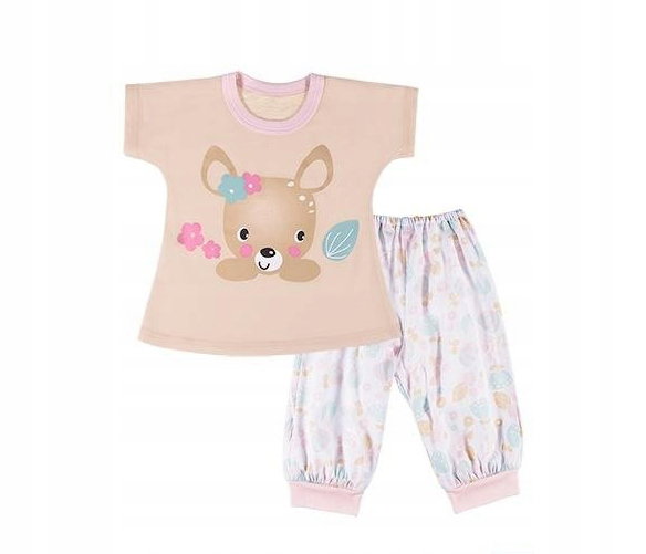 uszyta z miękkiej i przyjemnej w dotyku kolorowej dzianiny. Góra piżamki drukowana w nasz autorski wzór. W pasie spodni wszyta guma nie uwierająca brzuszka dziecka; bluzeczka z krótkim rękawkiem.