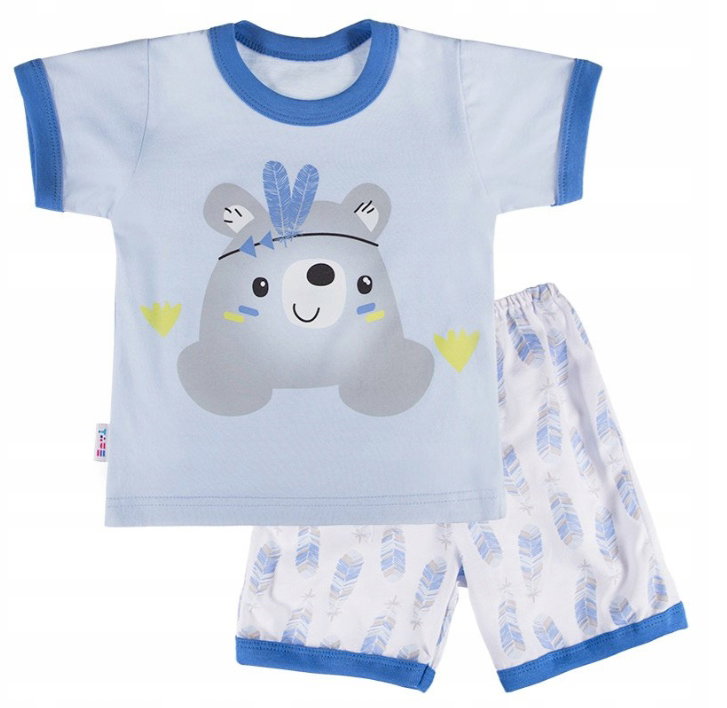 uszyta z miękkiej i przyjemnej w dotyku kolorowej dzianiny. Góra piżamki i spodenki drukowane w nasz autorski wzór. Krótkie spodenki posiadają śliczny wzór w listki. W pasie spodni wszyta guma nie uwierająca brzuszka dziecka; bluzeczka z krótkim rękawkiem.