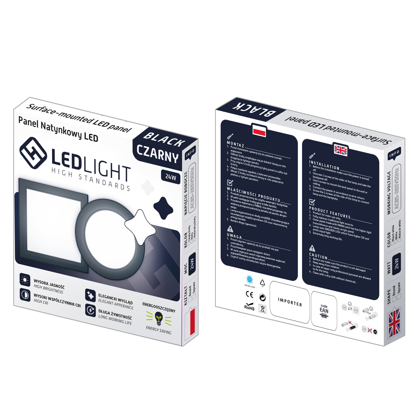Plafon led panel natynkowy niemrugający czarny ccd biały ciepły 24w