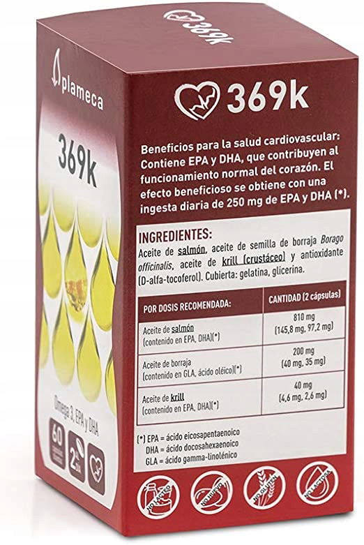 SUPLEMENT DIETY: 369K to suplement diety wyprodukowany z oleju z łososia, oleju z nasion ogórecznika lekarskiego Borago officinalis, oleju z kryla i przeciwutleniacza (D-alfa-tokoferol).