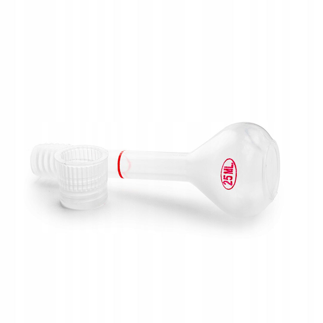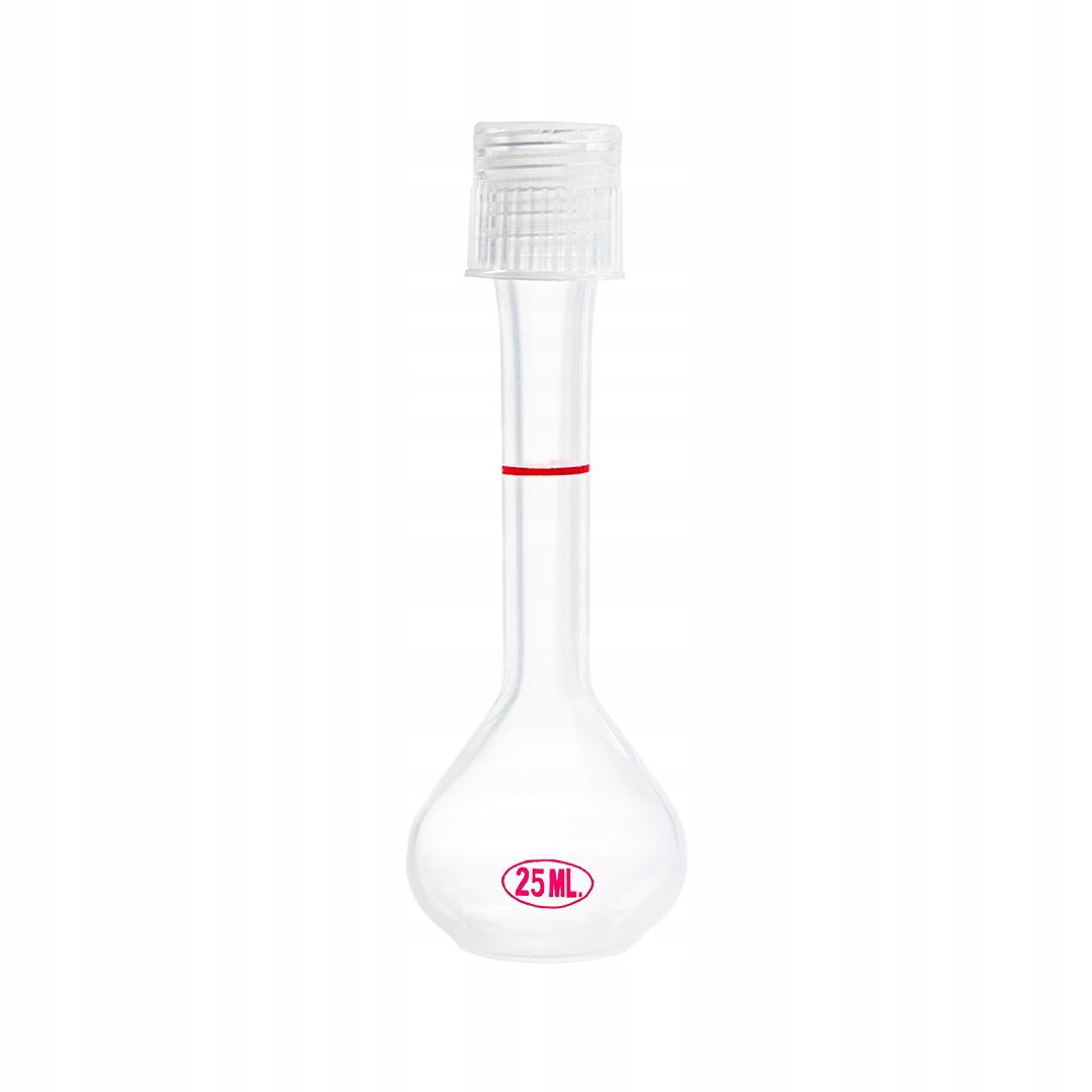 Kolba miarowa z nakrętką wykonana z polipropylenu PP. Odporna na uszkodzenia mechaniczne. Posiada podziałkę malowaną w kolorze czerwonym. Pojemność 25 ml