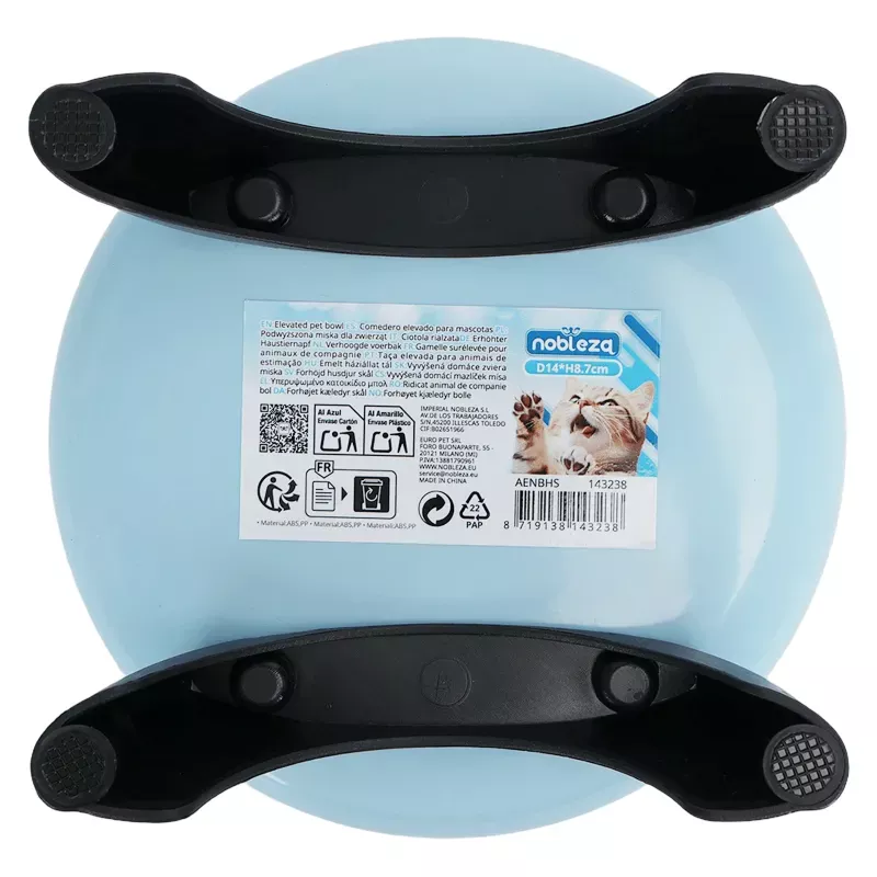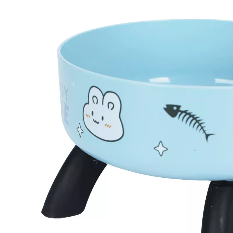 Miska dla kota na podwyższeniu, dostępna w kolorach niebieskim i różowym, która pomaga w wygodniejszym jedzeniu. Posiada nóżki podnoszące miskę, co poprawia ergonomię podczas posiłków.