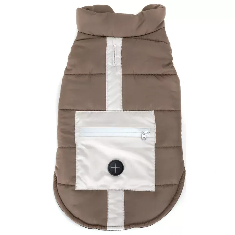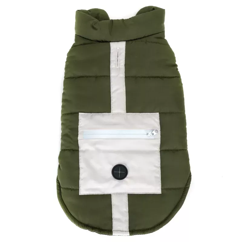 Posiada kieszeń na psie drobiazgi zamykaną suwakiem z elementami odblaskowymi, dodatkowo wyposażony w praktyczny otwór na smycz.