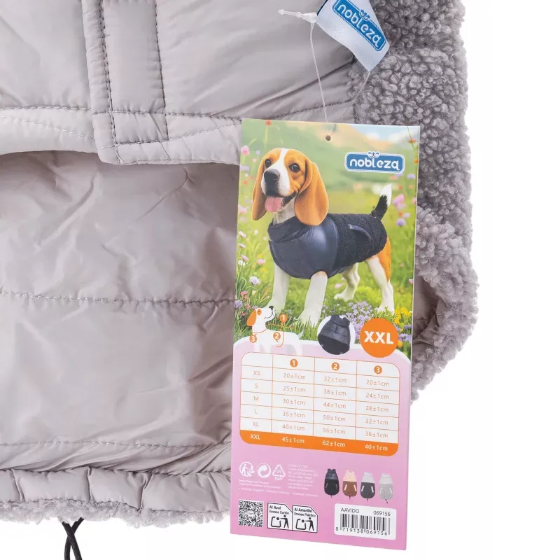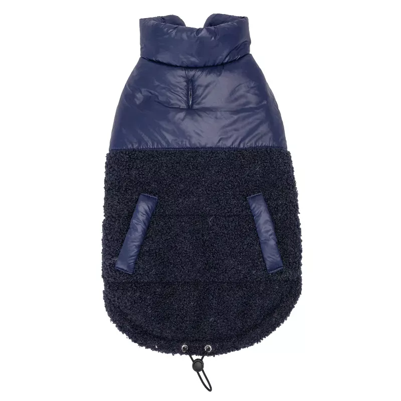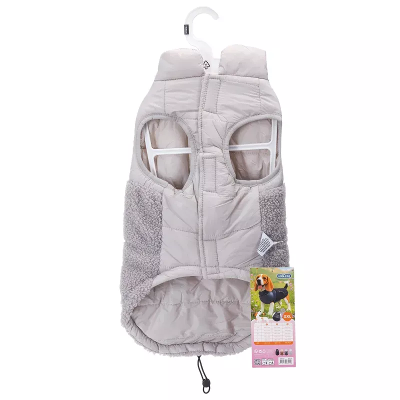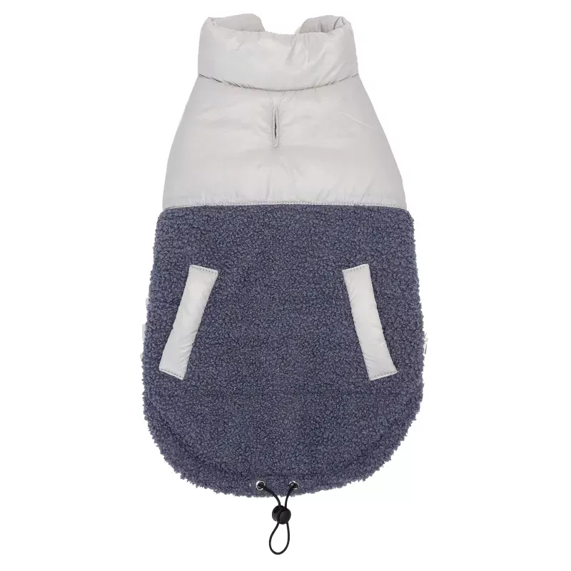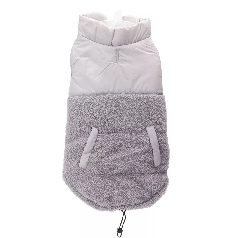 Lekki i oddychający, góra wykonana z nylonu zapewnia komfort w różnych warunkach atmosferycznych, tył docieplony futerkiem. Płaszcz jest wodoodporny, odporna na plamy, antystatyczny, co czyni go praktycznym wyborem. Dolna część z pluszowego polaru jest nie tylko urocza, ale także przyjazna dla skóry. Z tyłu ma regulowany sznurek, co pozwala na idealne dopasowanie, a otwór na smycz zwiększa wygodę użytkowania.