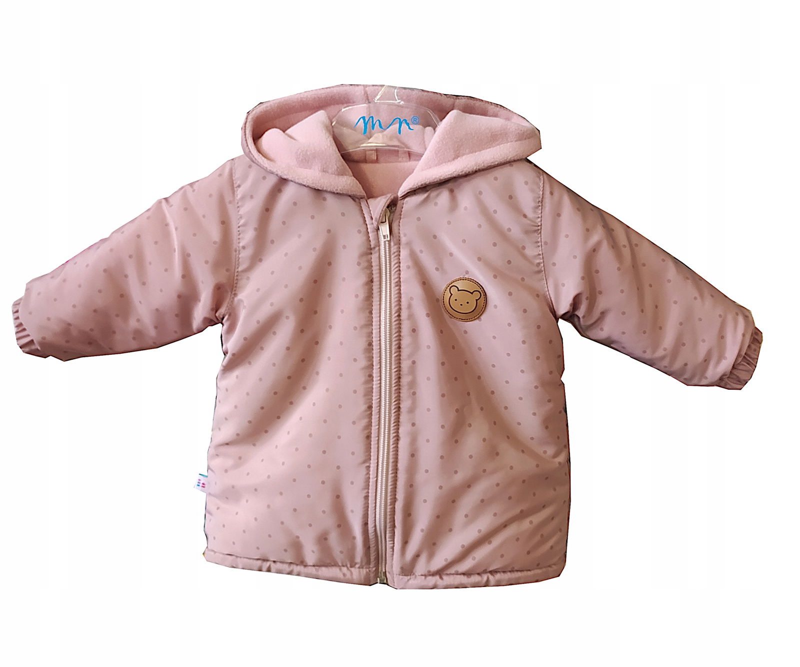 Płaszczyk uszyty z miękkiej i przyjemnej w dotyku tkaniny. Z przodu znajduje się naszywka z ekoskórki. Przód zapinany na suwaczek. Posiada wewnątrz ocieplinę i bawełnianą podszewkę.
