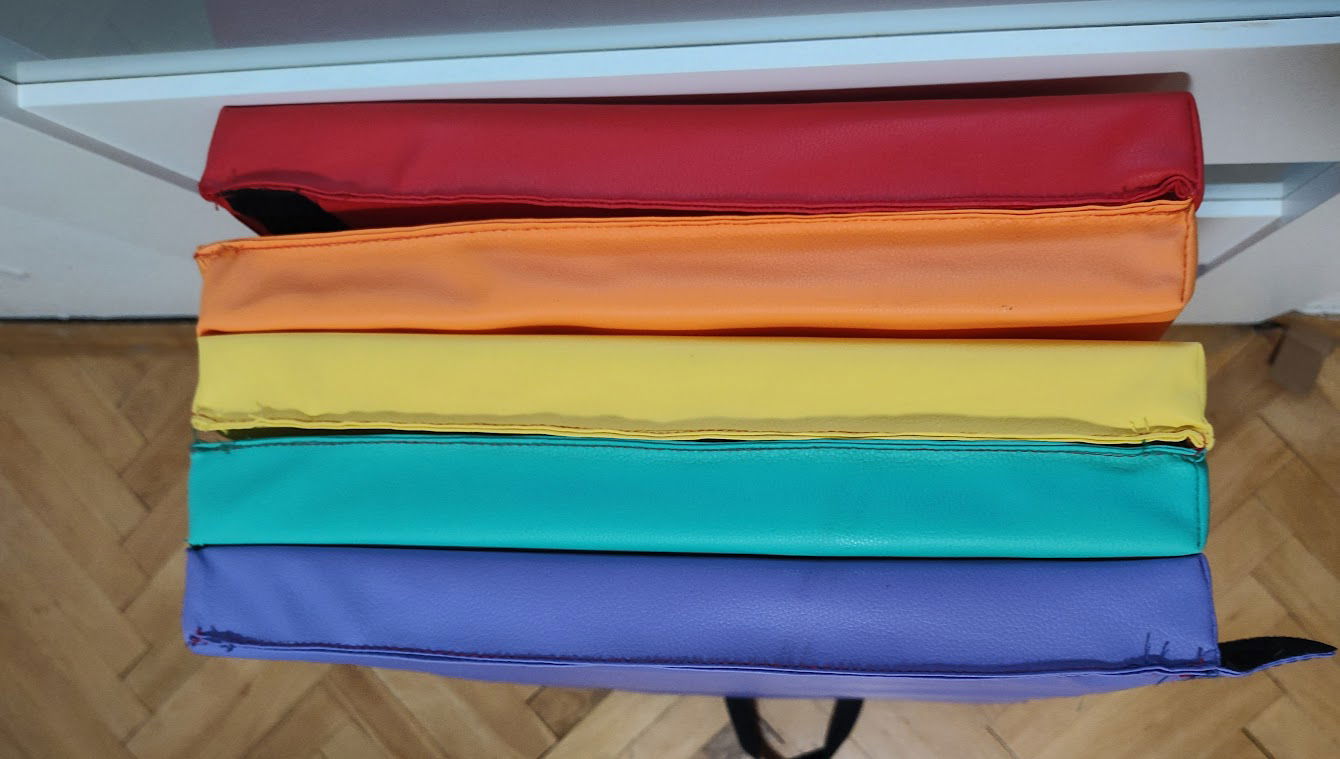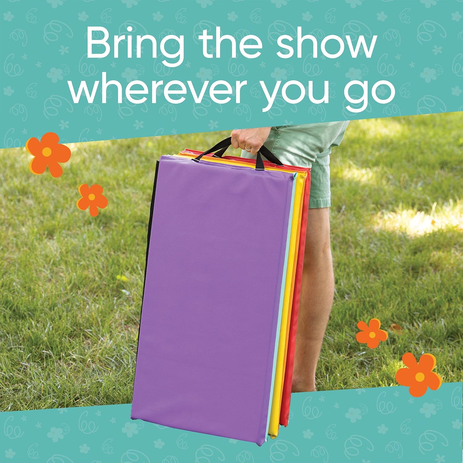 Dzięki panelowej formie można szybko ją złożyć. Dodatkowo uchwyty pozwalają na łatwe przenoszenie z miejsca na miejsce. Złożona mata może służyć jako dodatkowe, kolorowe siedzisko.