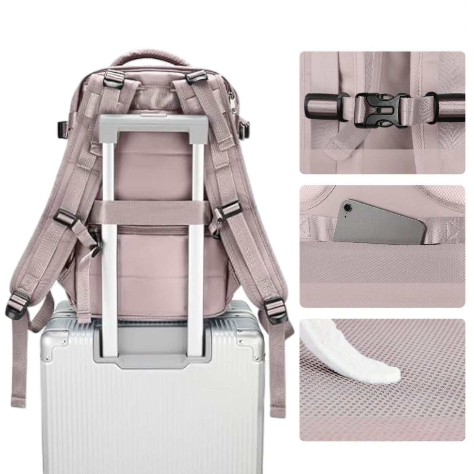 ✅Plecak ma pasek, który pozwala zaczepić go na rączkę walizki, co znacząco ułatwi Ci transport bagaży na lotnisku.