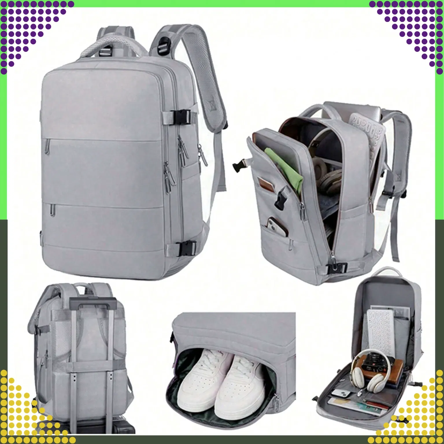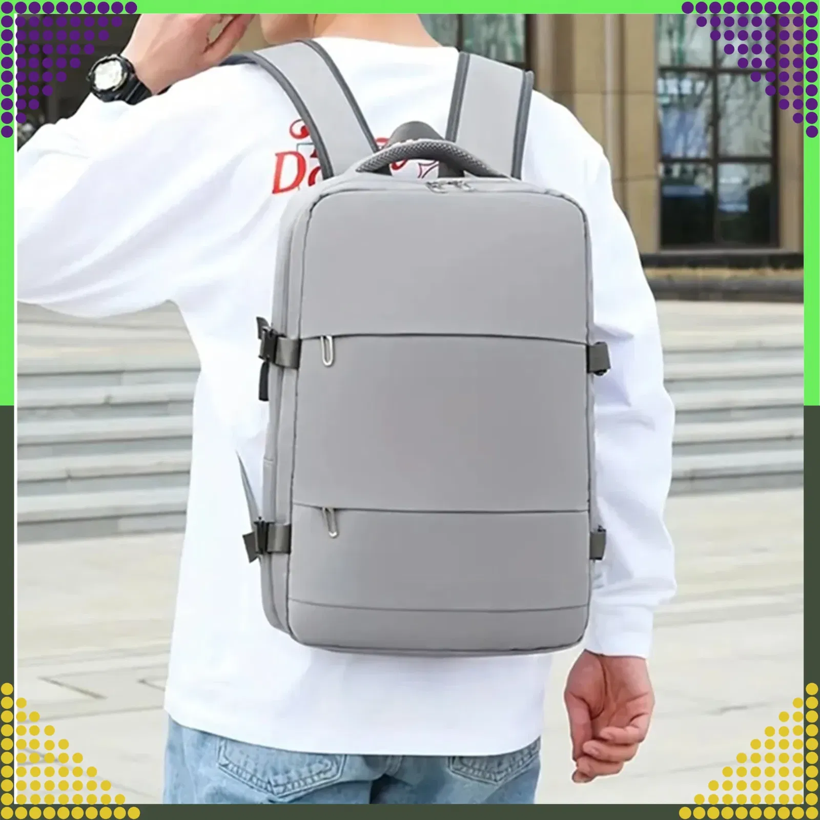 Plecak jest wykonany z wodoodpornego nylonu, który chroni twoje rzeczy przed wilgocią i zabrudzeniami. Ma cztery komory, w których możesz posegregować swoje rzeczy według własnych preferencji.
