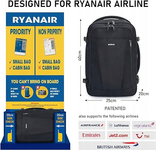 Torba pod siedzeniem ma wymiary 45x30x20 cm i pojemność 30L, a jej waga wynosi 0.55kg. Oprócz Ryanair, nadaje się również do Easyjet, British Airways, Etihad, Emirates i innych linii lotniczych.