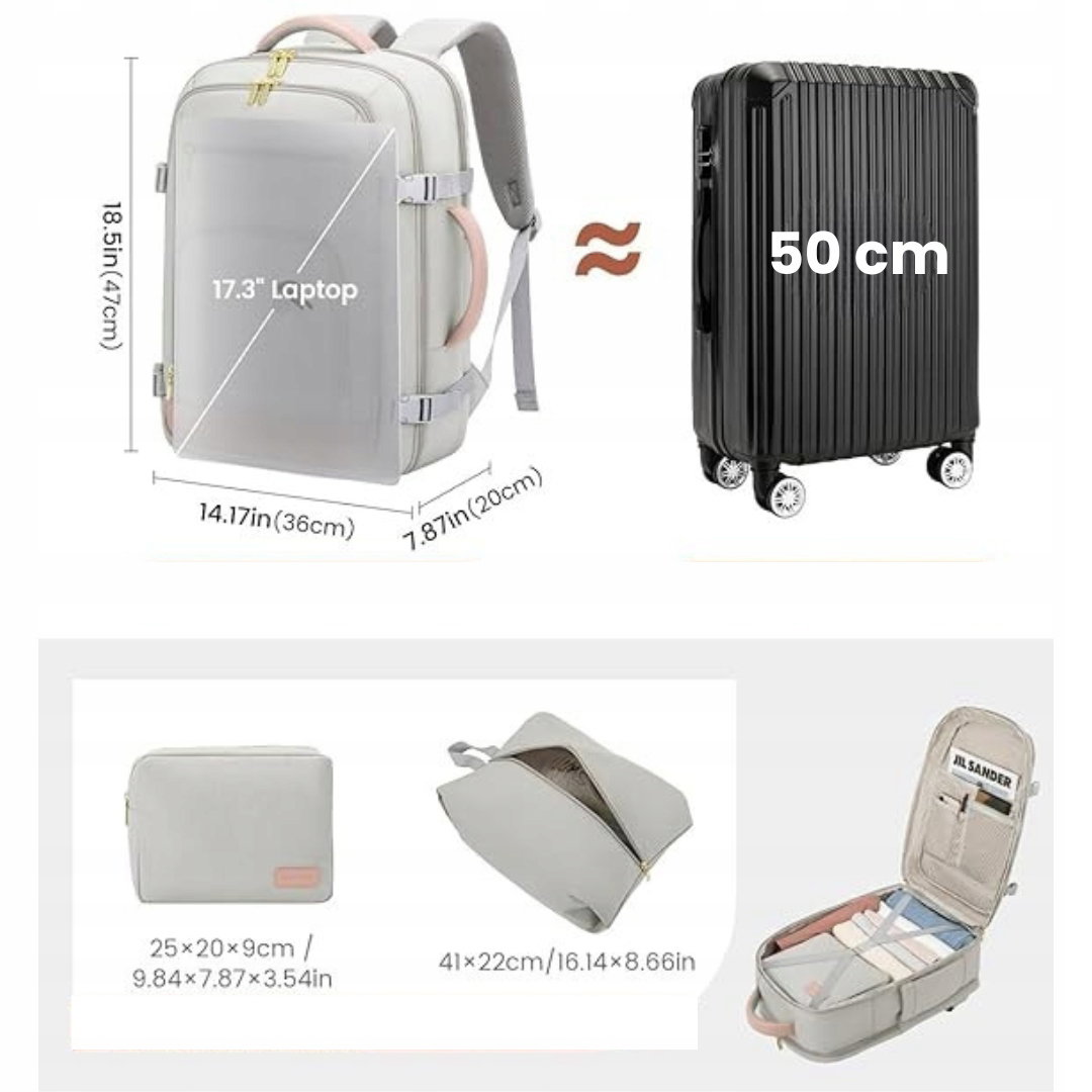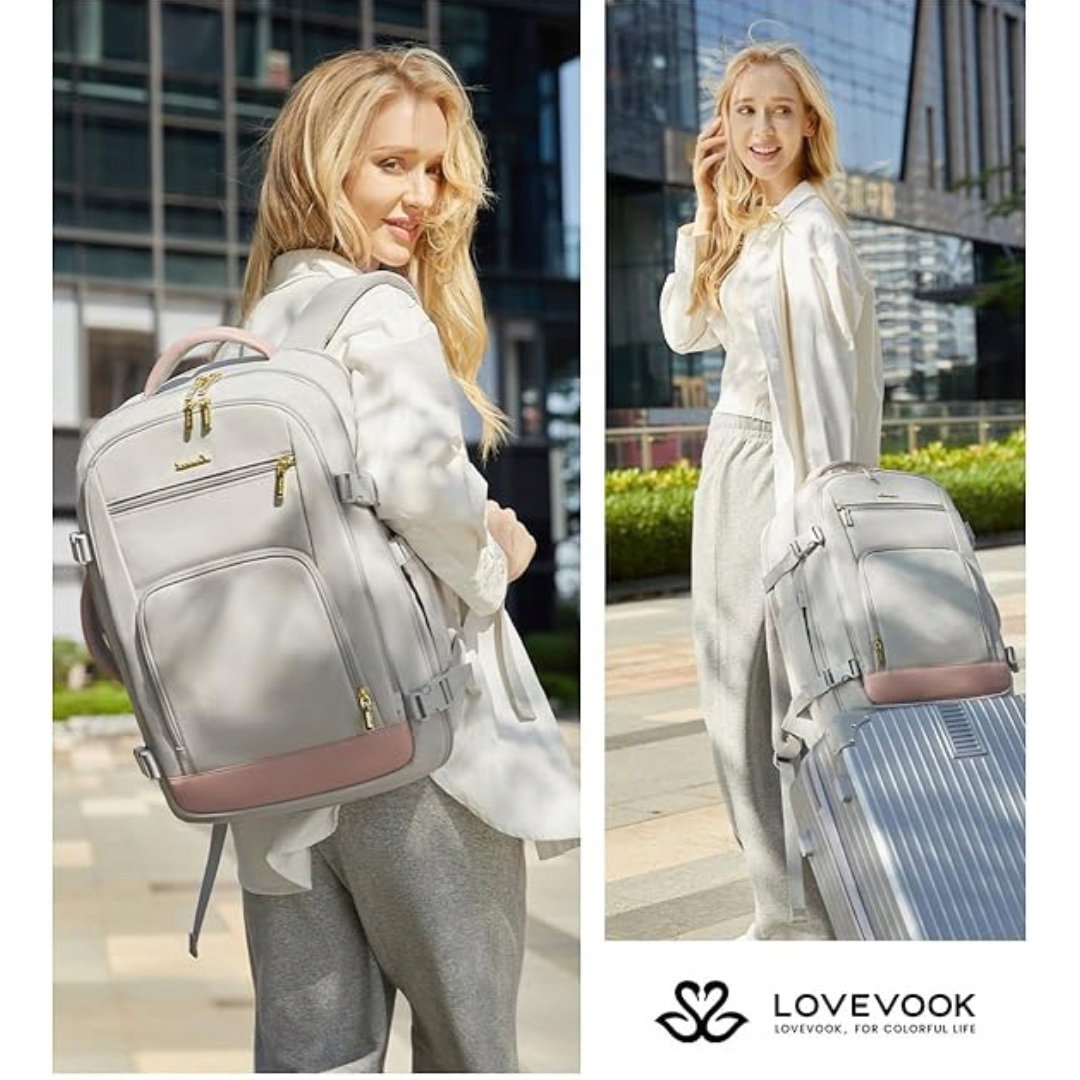LOVEVOOK damski wodoodporny plecak podróżny 40 L do samolotu, z miejscem na laptopa 17 cali, to funkcjonalny bagaż kabinowy zaprojektowany z myślą o wygodnym pakowaniu i organizacji rzeczy podczas podróży.