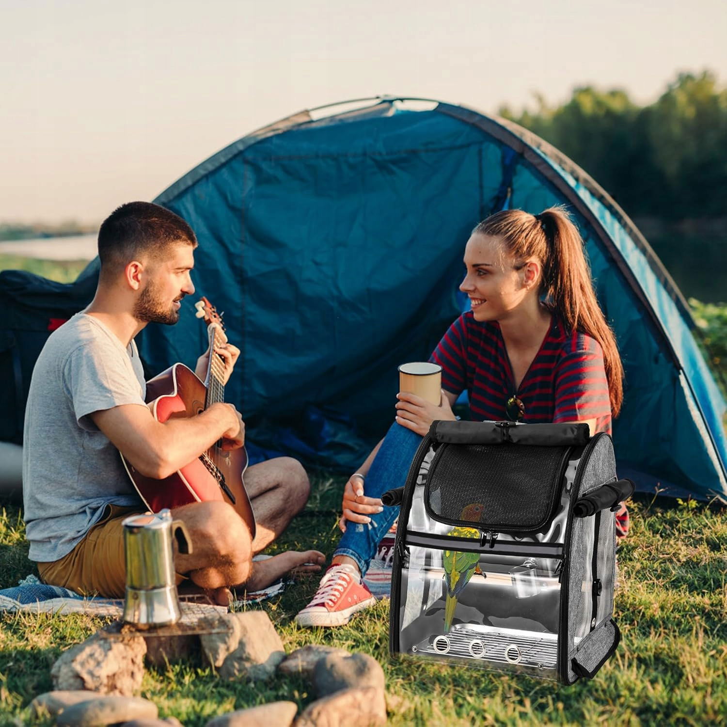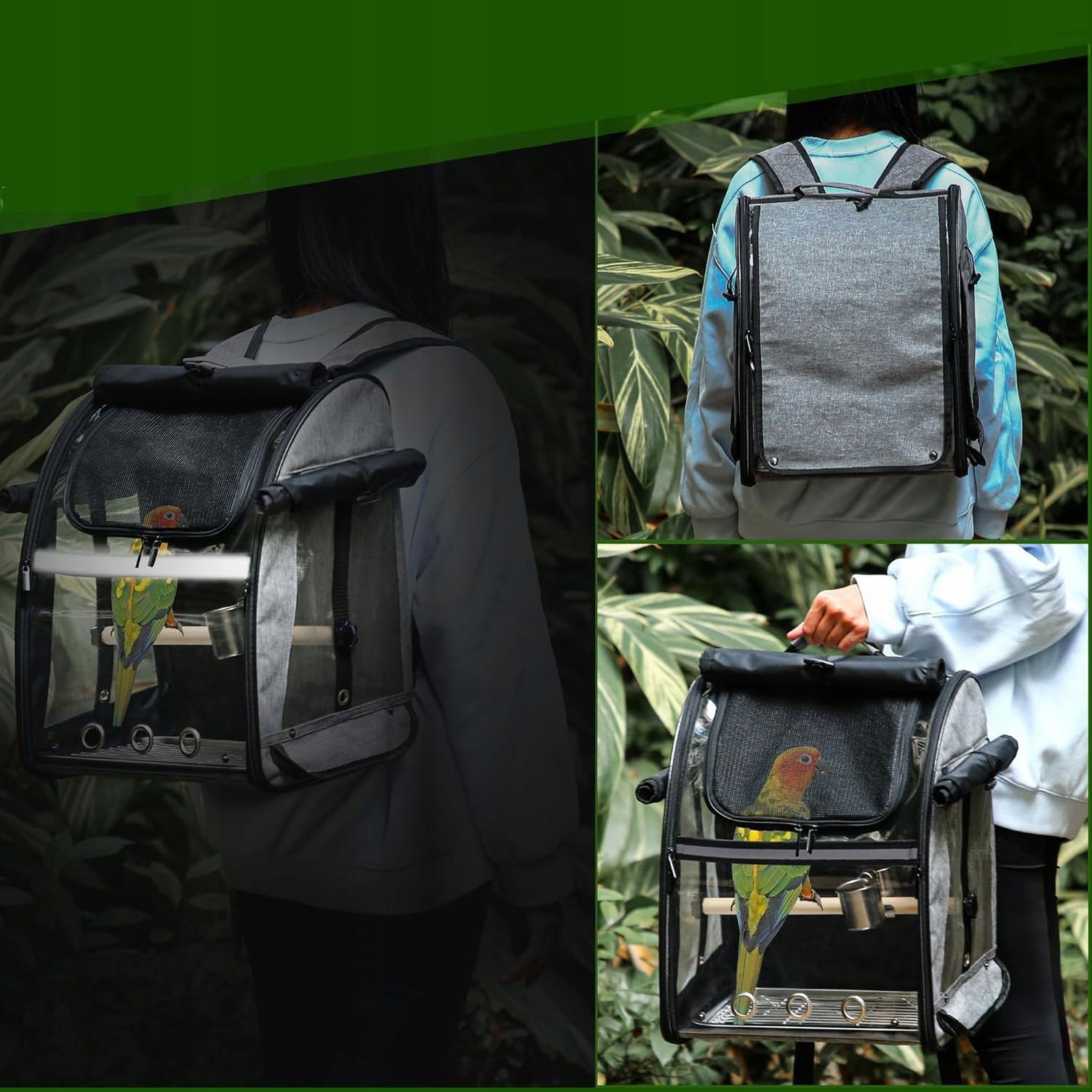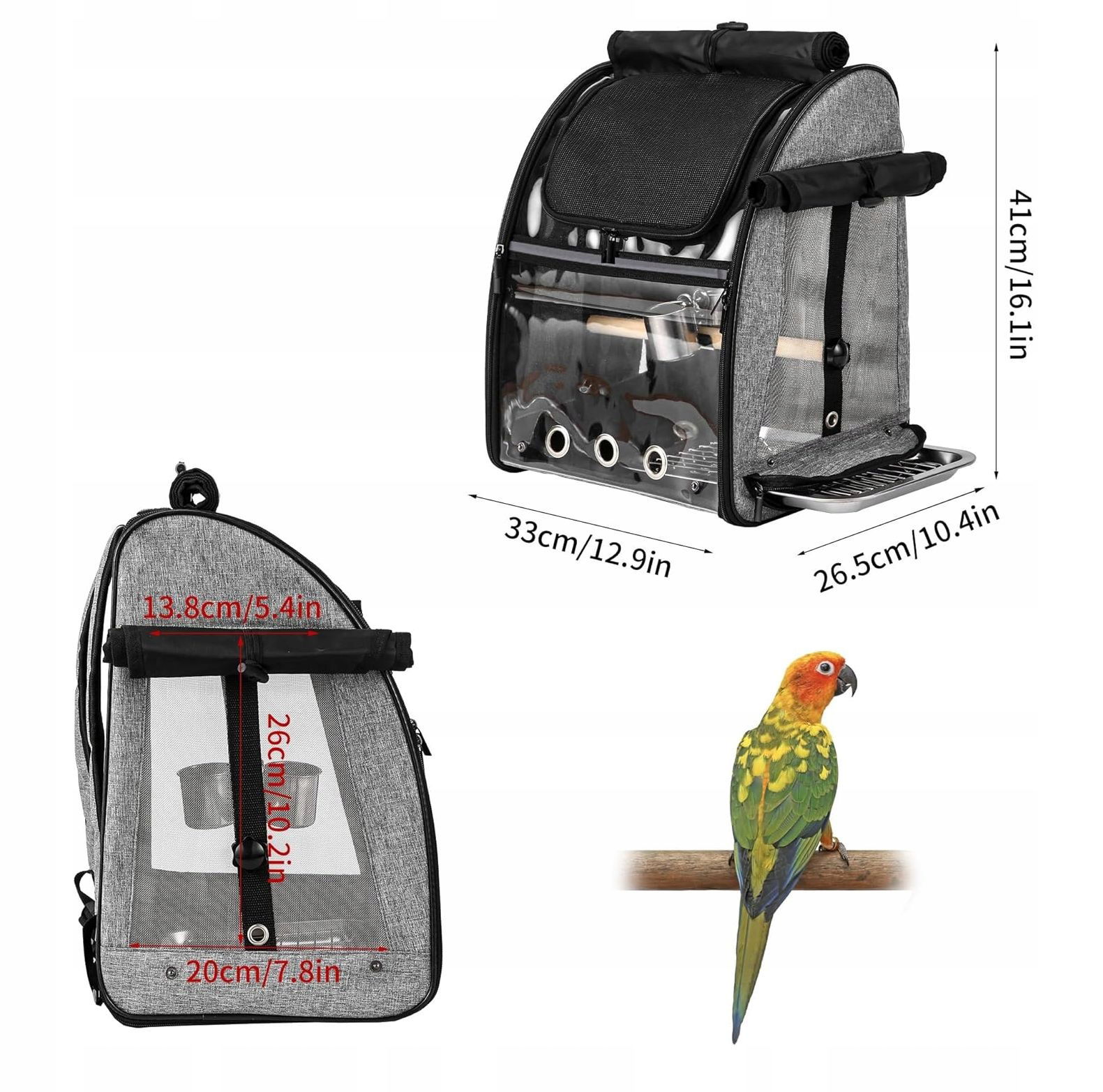 Plecak posiada przezroczyste ściany, które pozwalają ptakowi obserwować otoczenie, a właścicielowi na bieżąco kontrolować jego stan.