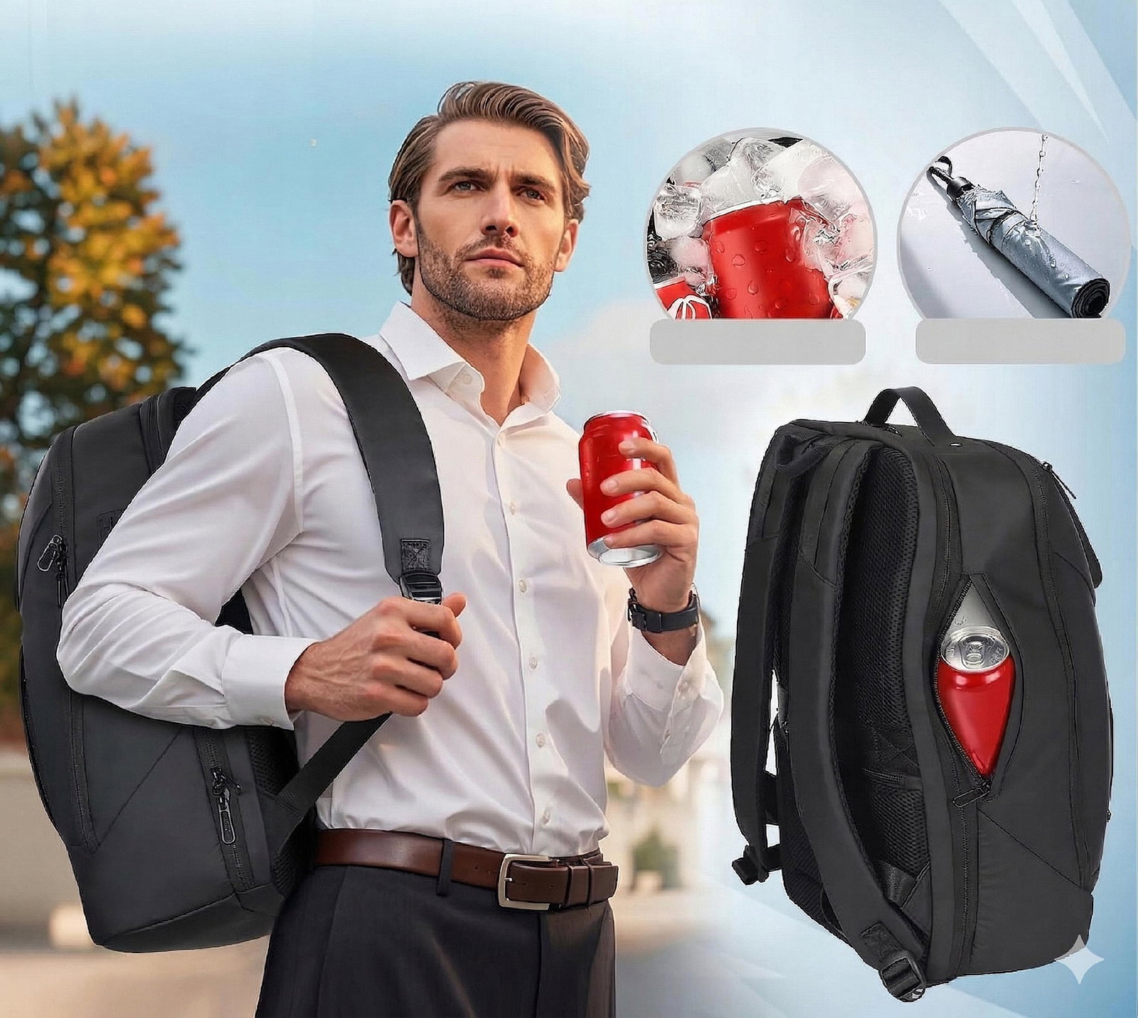 - Kieszeń Termiczna (Izolowana): Unikalna funkcja w plecakach biznesowych! Z boku znajduje się wbudowana, izolowana termicznie kieszeń. Jest idealna do przechowywania mokrego, składanego parasola lub prowiantu (np. dwóch puszek napoju) – skutecznie utrzymuje pożądaną temperaturę przez 1-2 godziny.